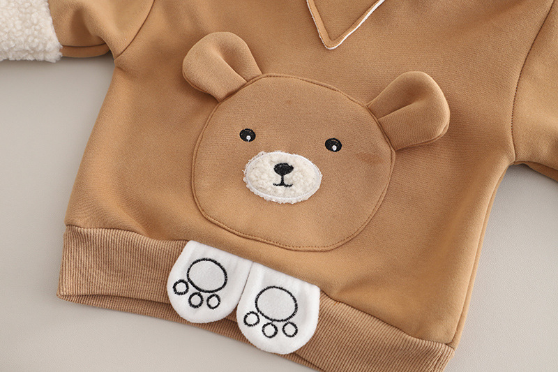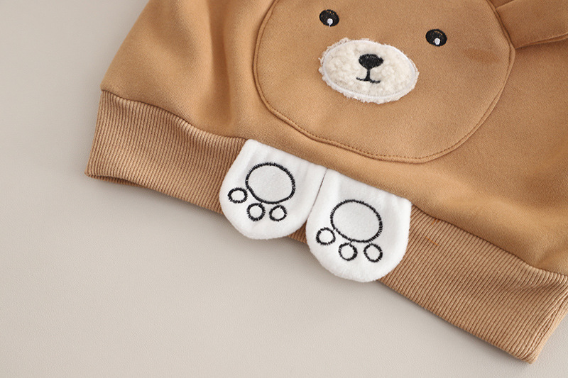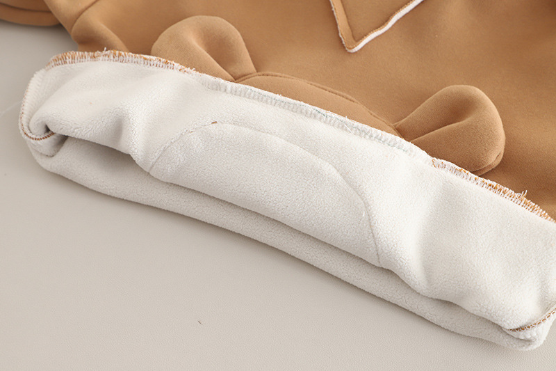 -Блузка/суитшърт от висококачествена памучна материя в карамелен цвят. Моделът е украсен с мече и 3D ушички за игрив акцент, с плюшени зони на ръкавите и бяла качулка, също от плюш, за допълнителна топлина и стил.