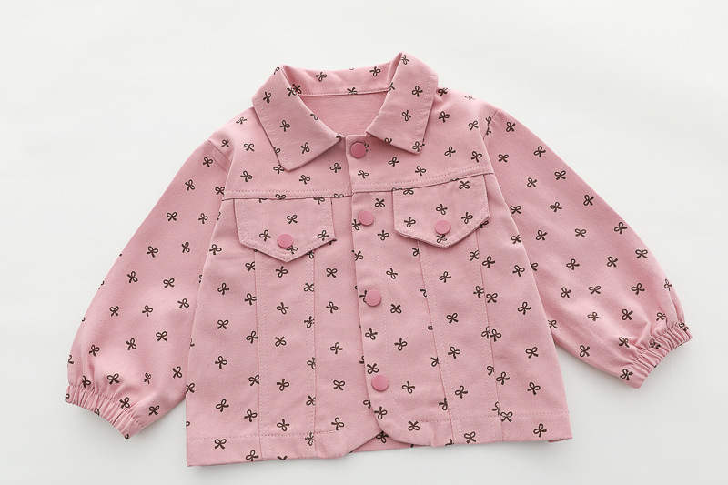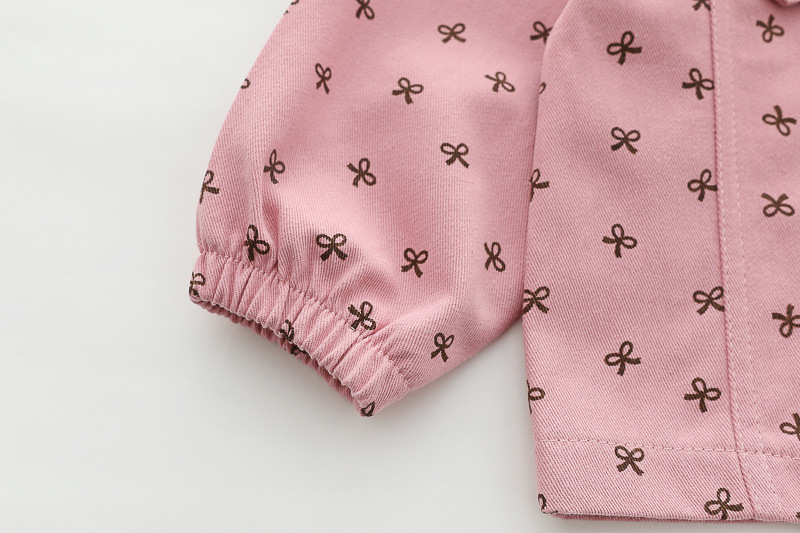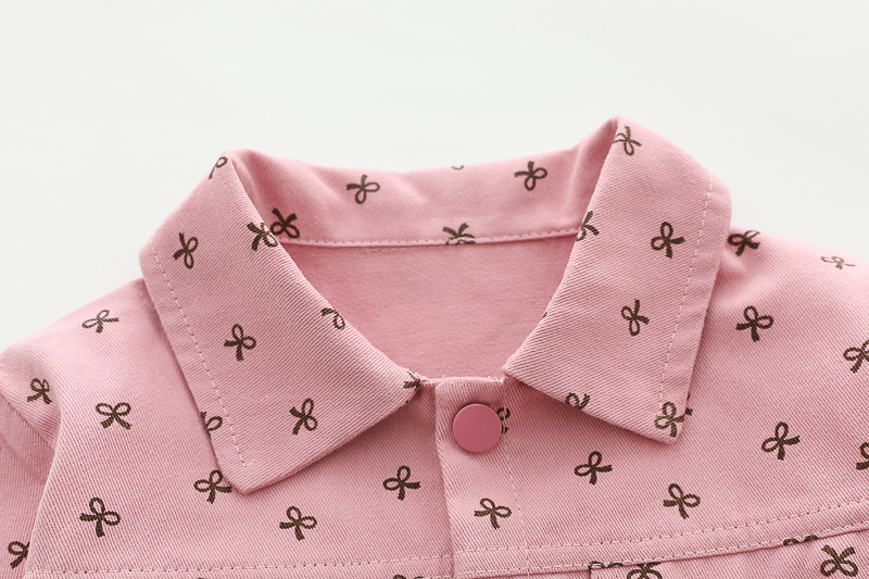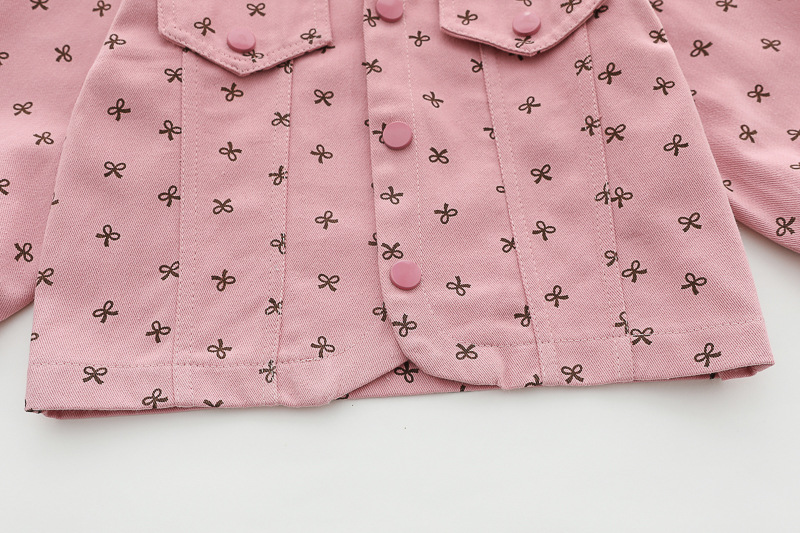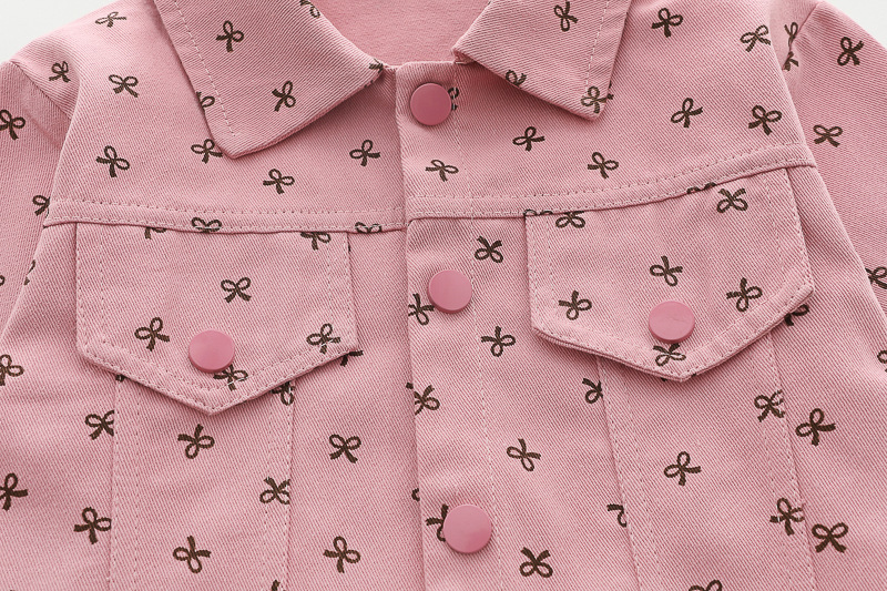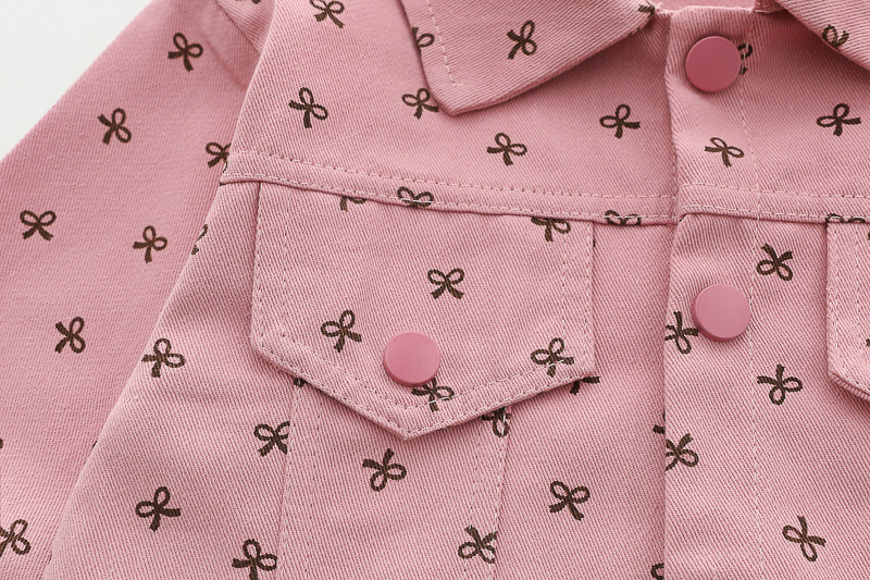 – Яке от тънък деним в розов цвят, декорирано с фини щампи на тъмносини панделки. Моделът е с класическа яка, два декоративни джоба с капаци и тик‑так копчета по цялата дължина. Ръкавите са завършени с ластик – за максимален комфорт.
