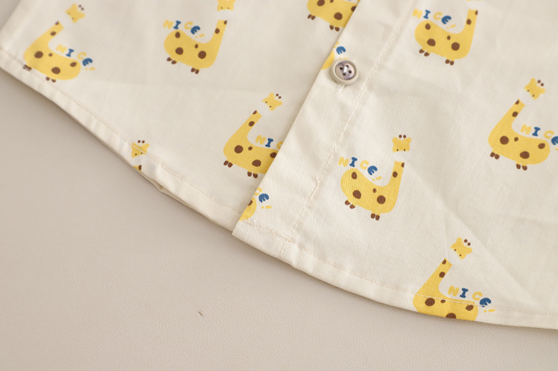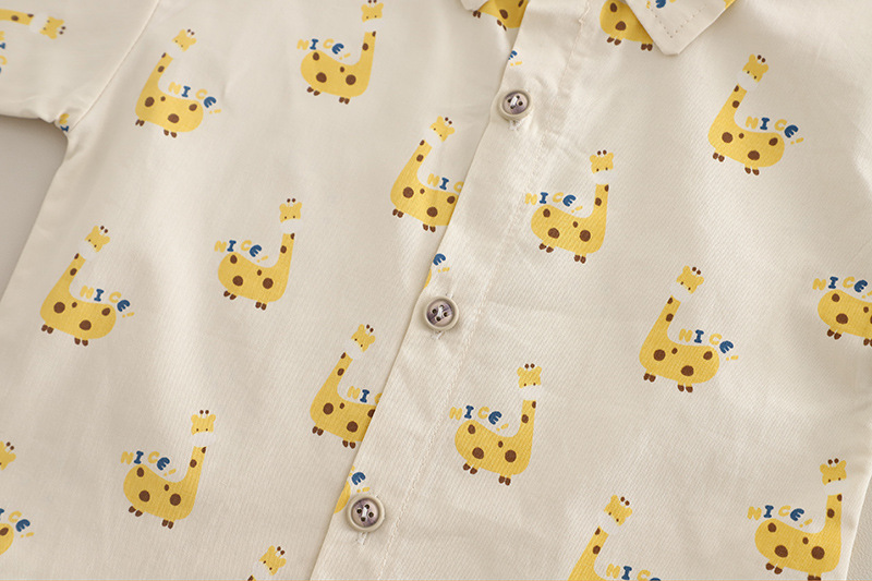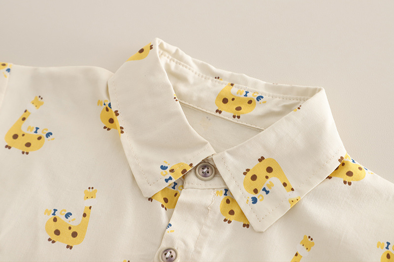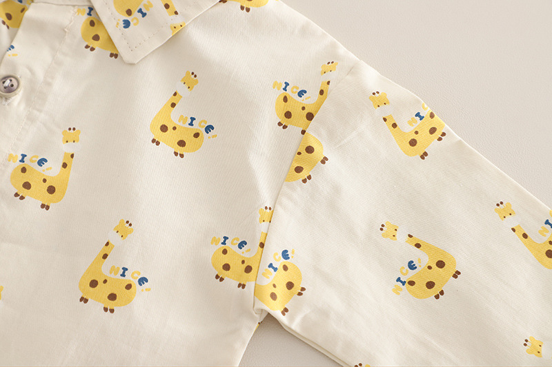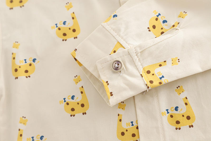 – Бяла памучна ризка с дълъг ръкав, класическа яка и цялостен принт с весели жирафчета – страхотен акцент, който носи настроение.