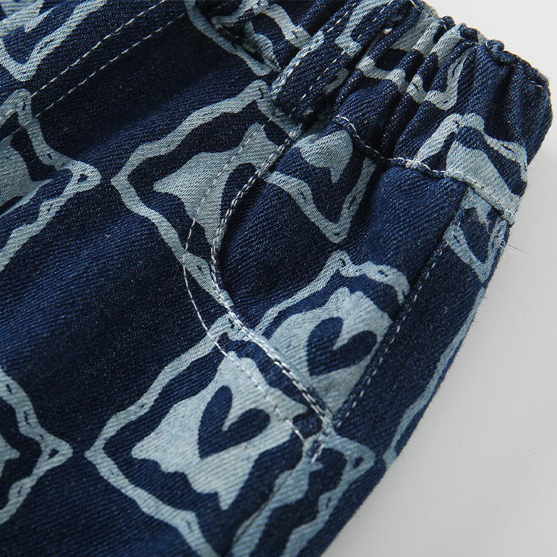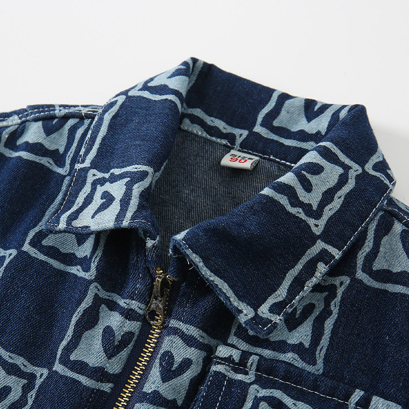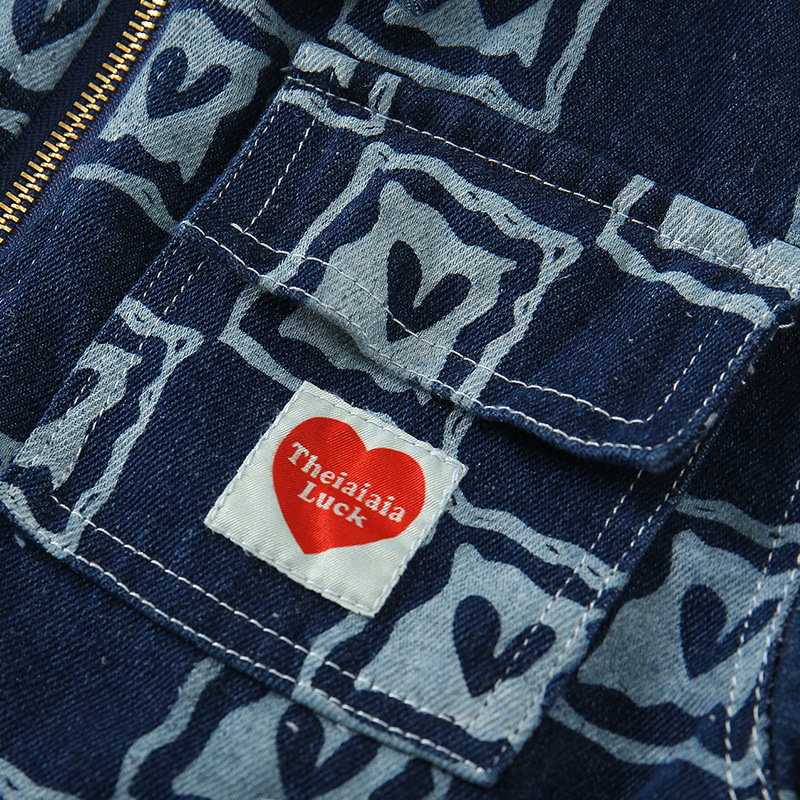 – Дънков бомбър от мека материя с цял цип и класическа яка. All-over десен от светлосини карета с малки сърца върху тъмен индиго фон. Два предни джоба и един малък джоб в предната част. Еластични маншети и подгъв – за комфортно прилягане.