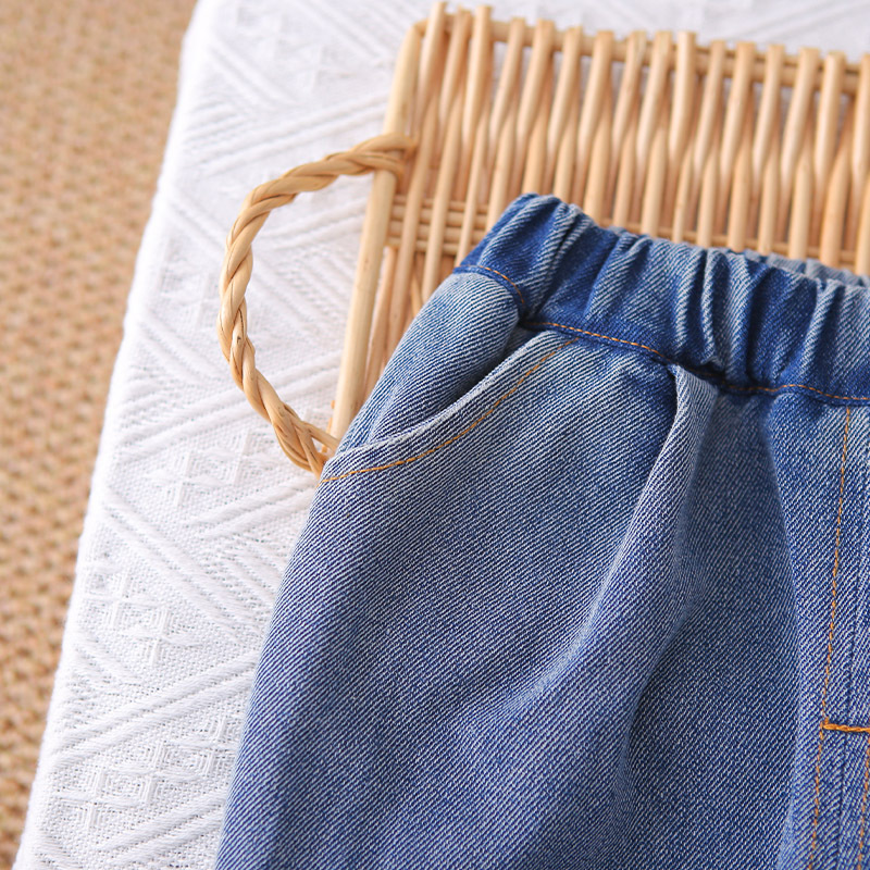 -Панталон от същия деним, с широк ластик в талията и на глезените; дизайнът е с подчертани декоративни шевове на коленете и два джоба – стилен и практичен завършек.