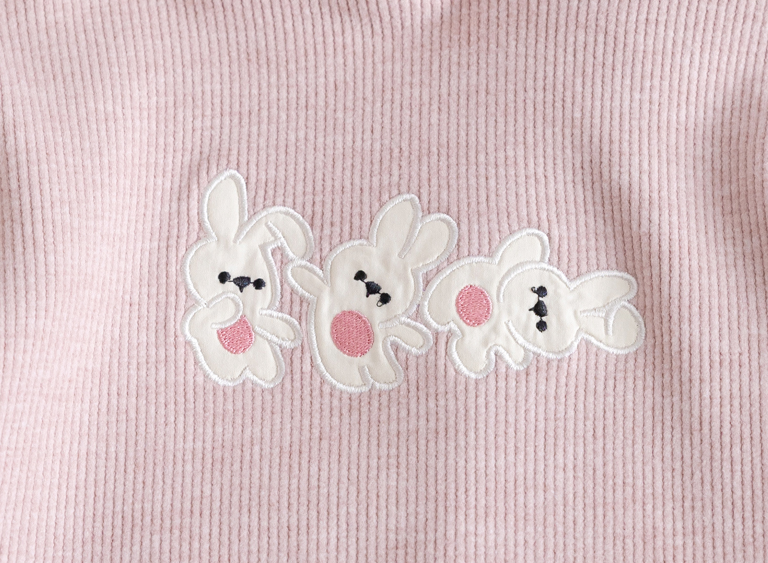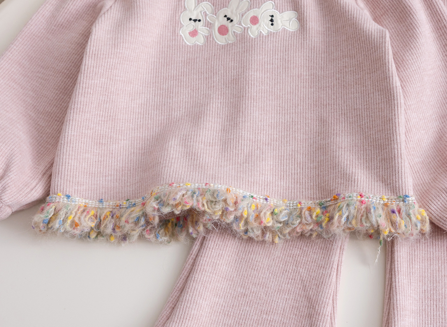 – Блузка/Суитшърт с качулка от мека рипс материя в цвят пепел от рози. Модел с качулка и 3D ушички, сладка щампа на зайчета в предната част и пъстри ресни, пришити в долната част като акцент на модела + ластични маншети на китките за комфорт и удобство при носене.