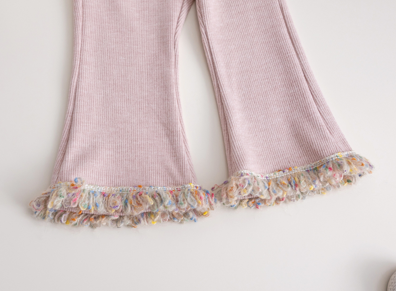 – Панталон от същата материя с клош ефект и ресни-декорация в долната част за extra закачлива визия, ластик на талията и две джобчета.