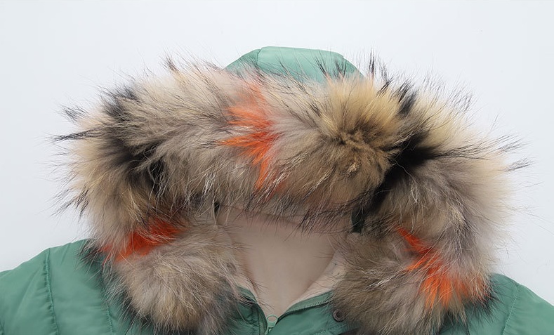 🌨️ Модел в свеж зелен цвят с обемна качулка, декорирана с богат естествен пух със стилни цветни акценти.