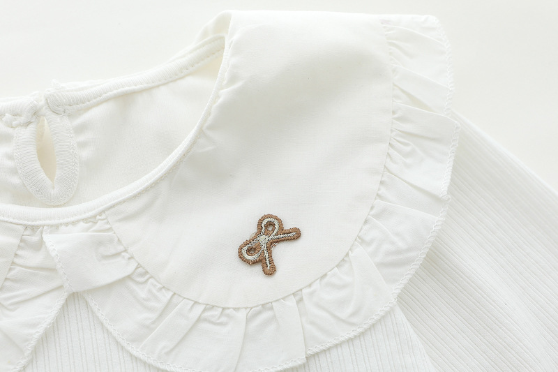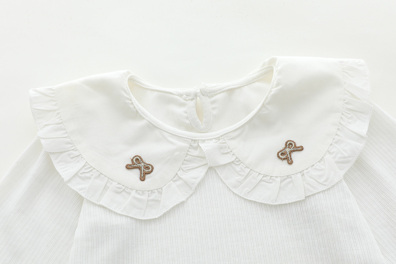 – Блуза с яка тип „Питър Пан“ в чисто бяло, от мек рипс плат. Обло деколте и две малки бродирани панделки отпред. Закопчаване с копче на тила за удобно обличане.