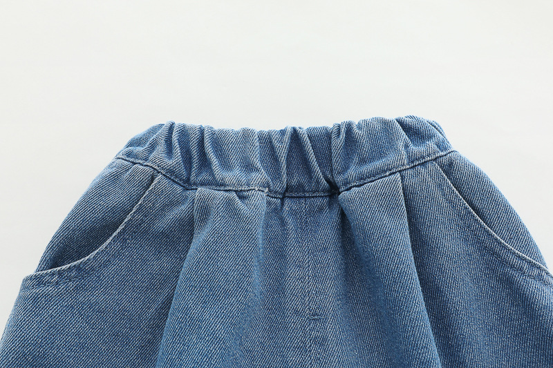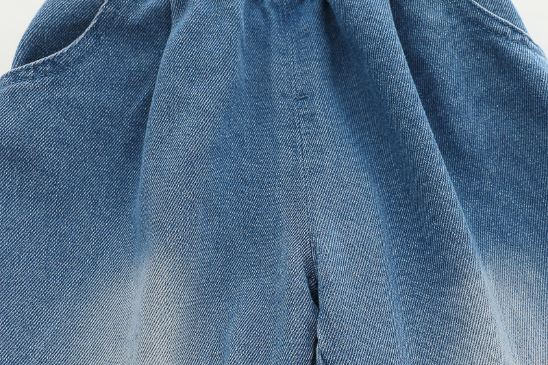 – Дънков панталон тип „Чарлстон“ в класически син деним, с еластична талия, два джоба и дантелен кант на подгъва на крачолите – като романтичен акцент.