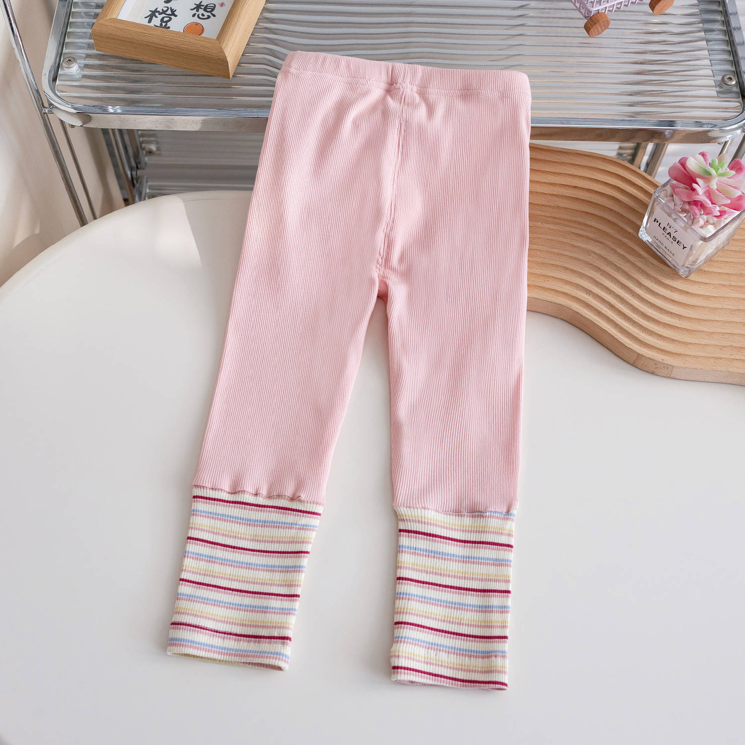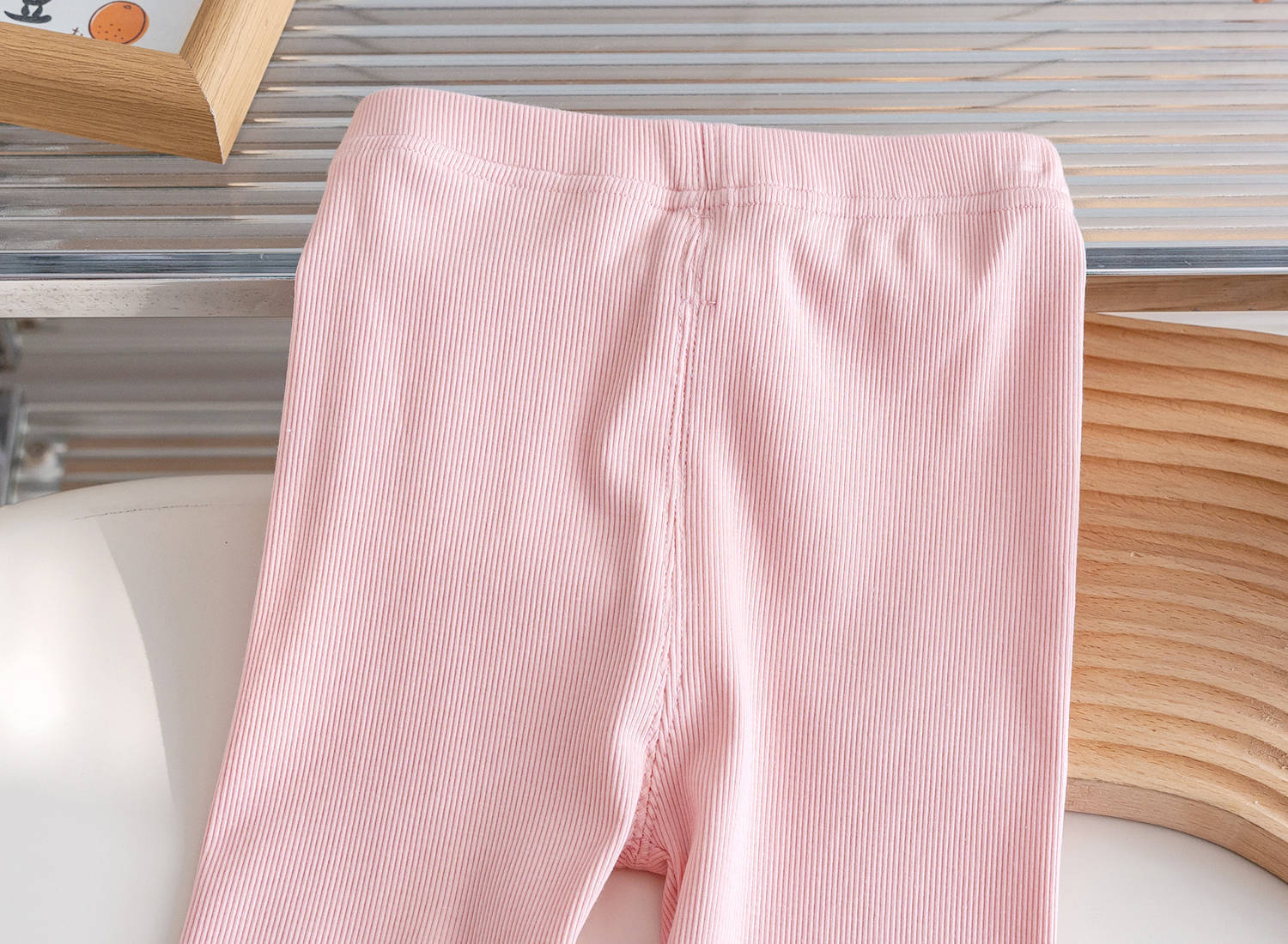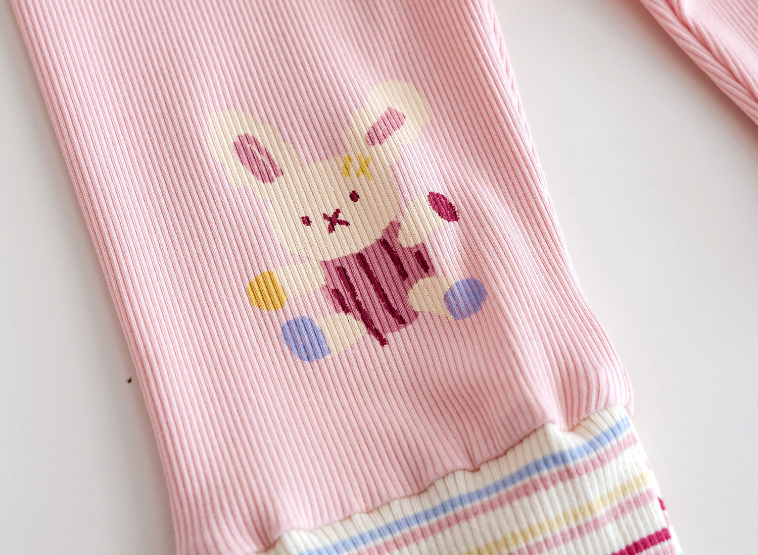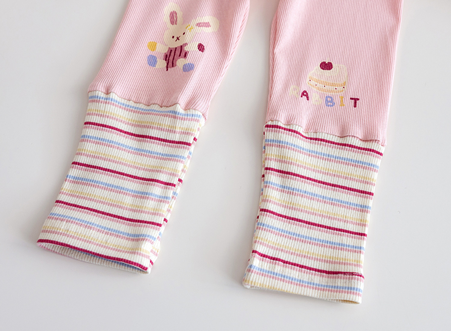 – Рипсен клин от висококачествена, устойчива и еластична материя в пастелно розово, с цветни принтирани апликации – зайче, кексче и надпис „RABBIT“, както и райе в долната част на крачолите за игрив завършек.