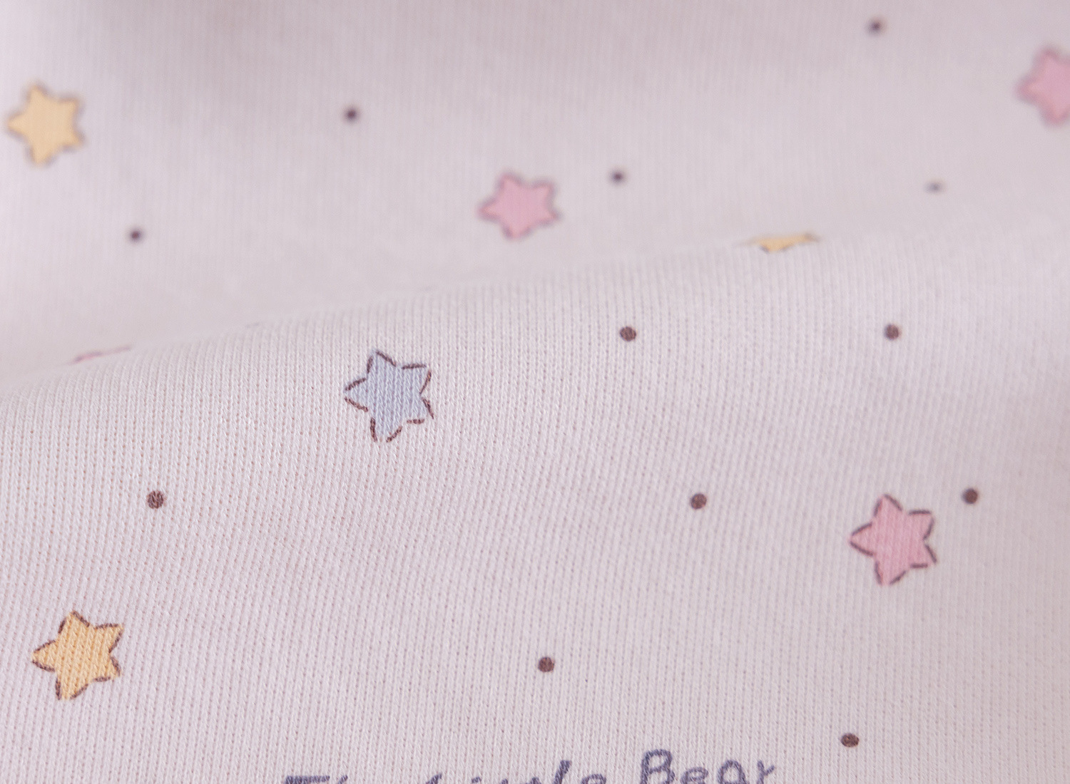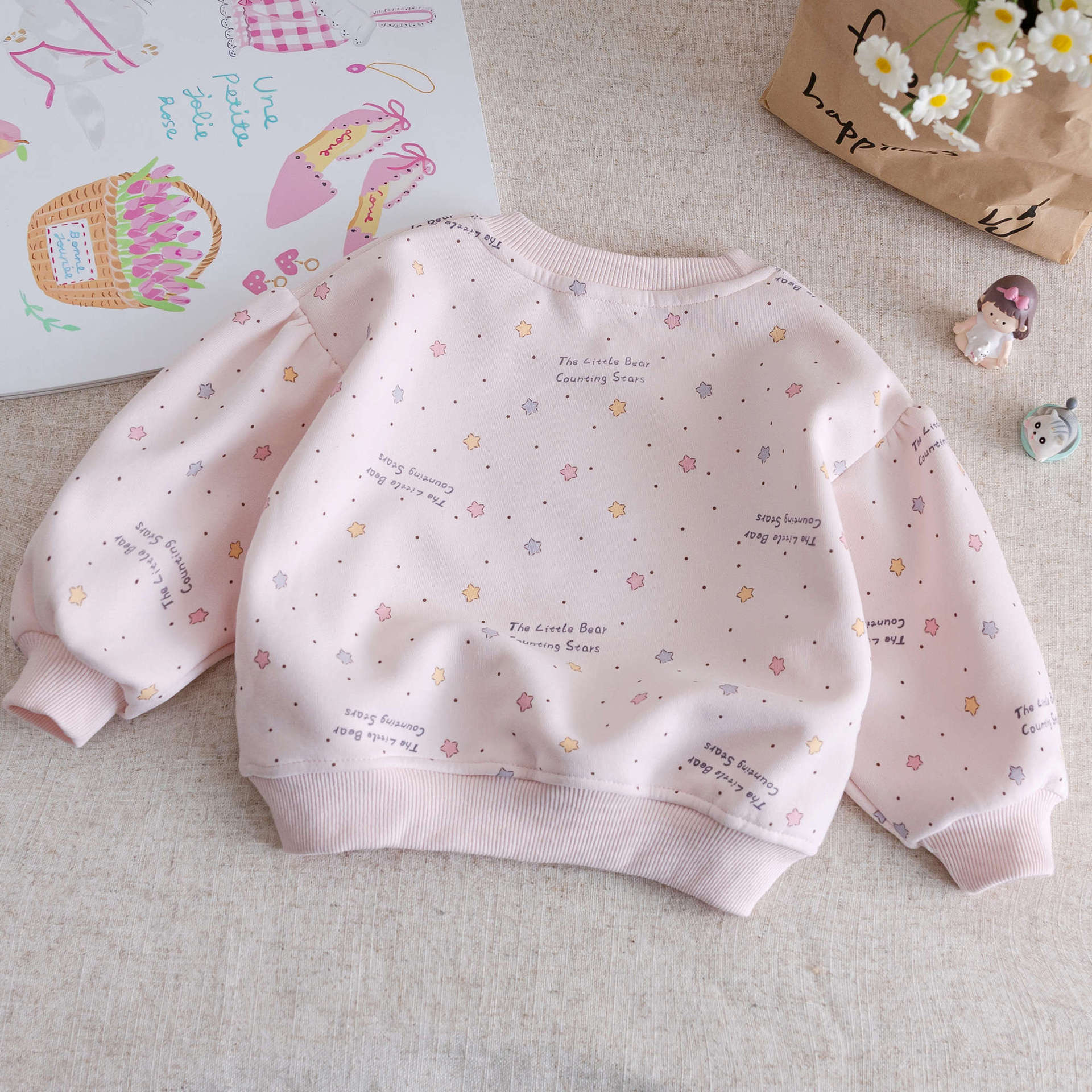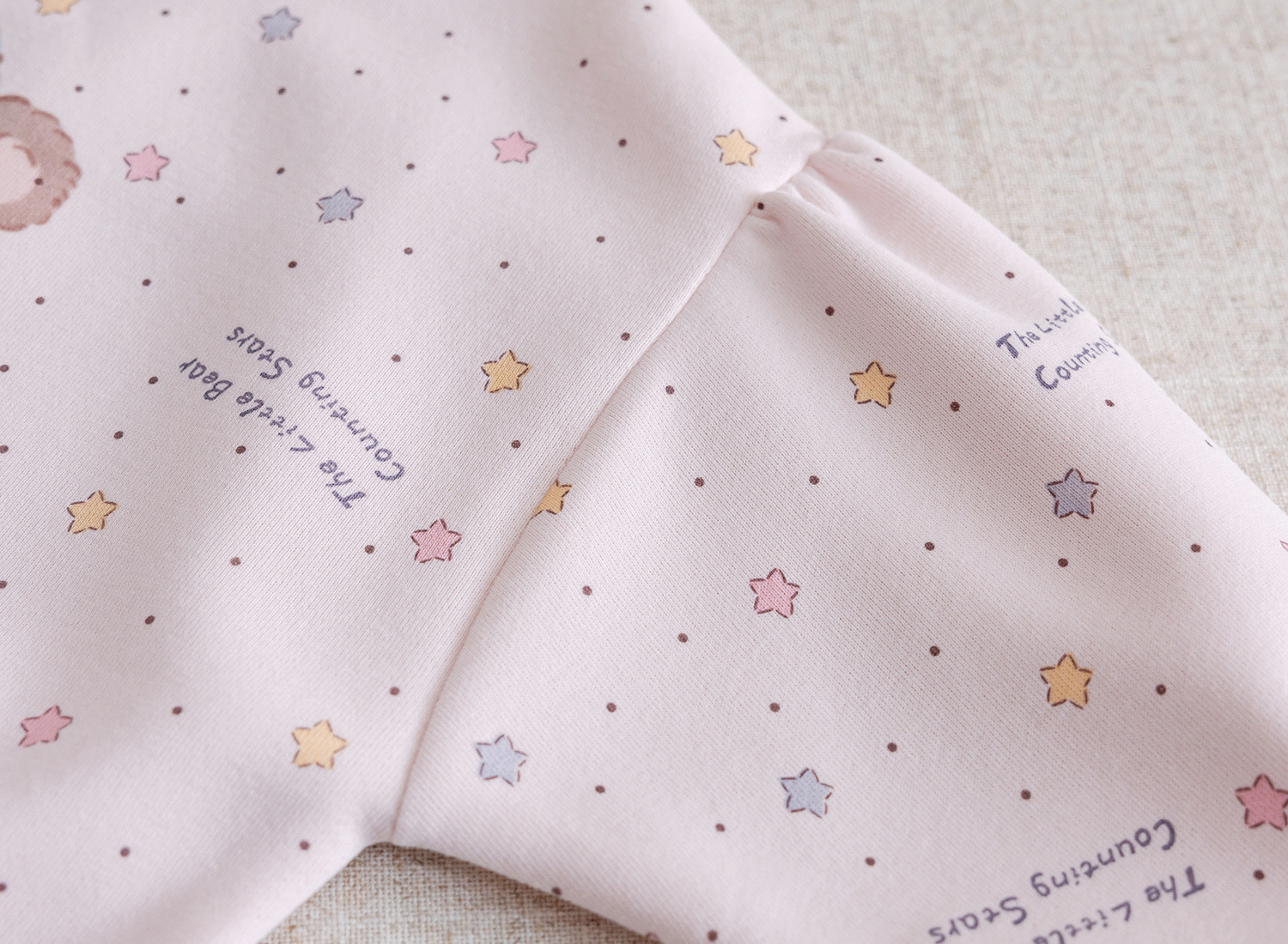 – Суитшърт от памук в нежно розово, украсен с щампа на пухкав мечок, звездички и надписи. Дизайнът е допълнен с леко буфан ръкавче и широк еластичен кант за повече свобода при движение.