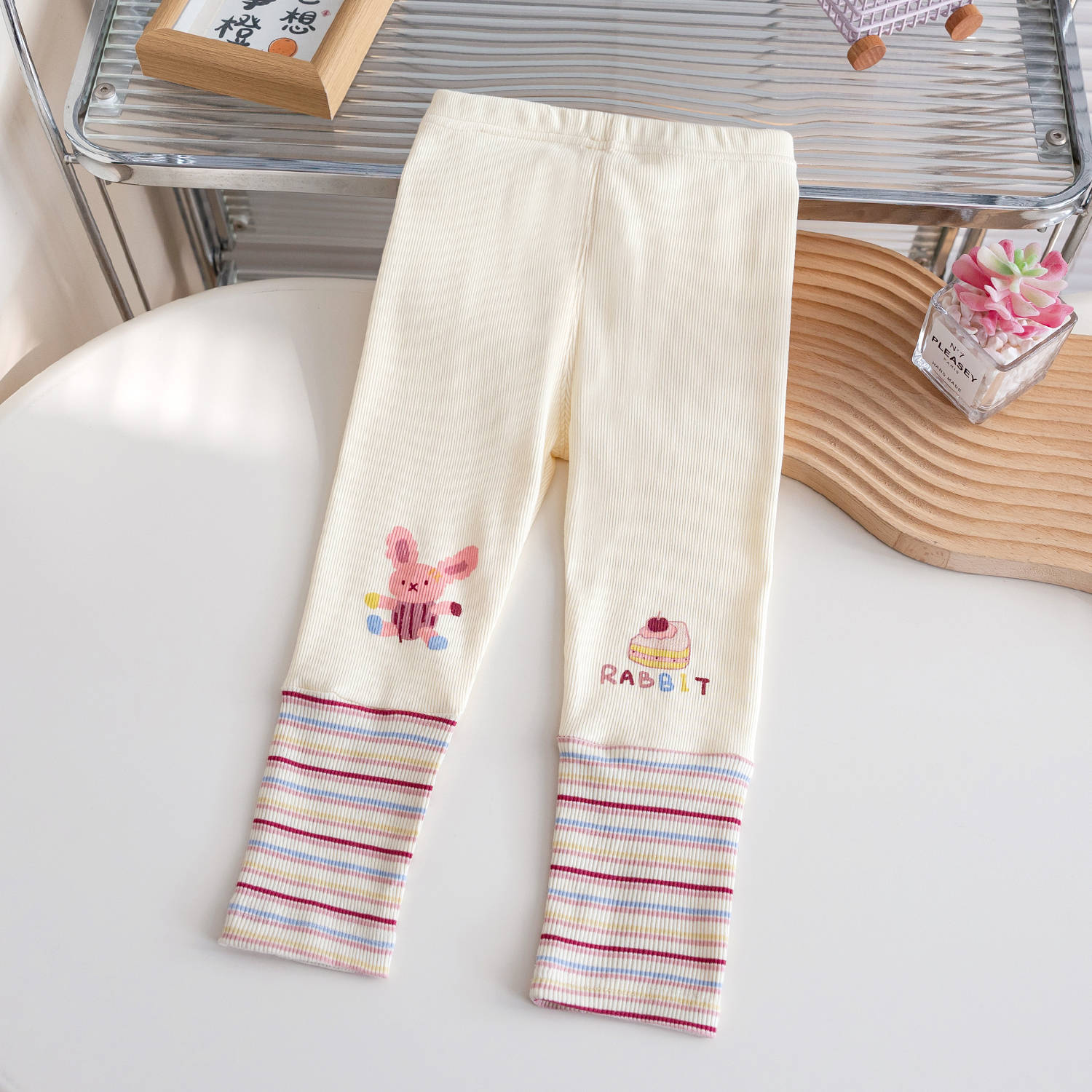 – Рипсен клин от висококачествена, устойчива и еластична материя в цвят екрю, с цветни принтирани апликации – зайче, кексче и надпис „RABBIT“, както и райе в долната част на крачолите за игрив завършек.