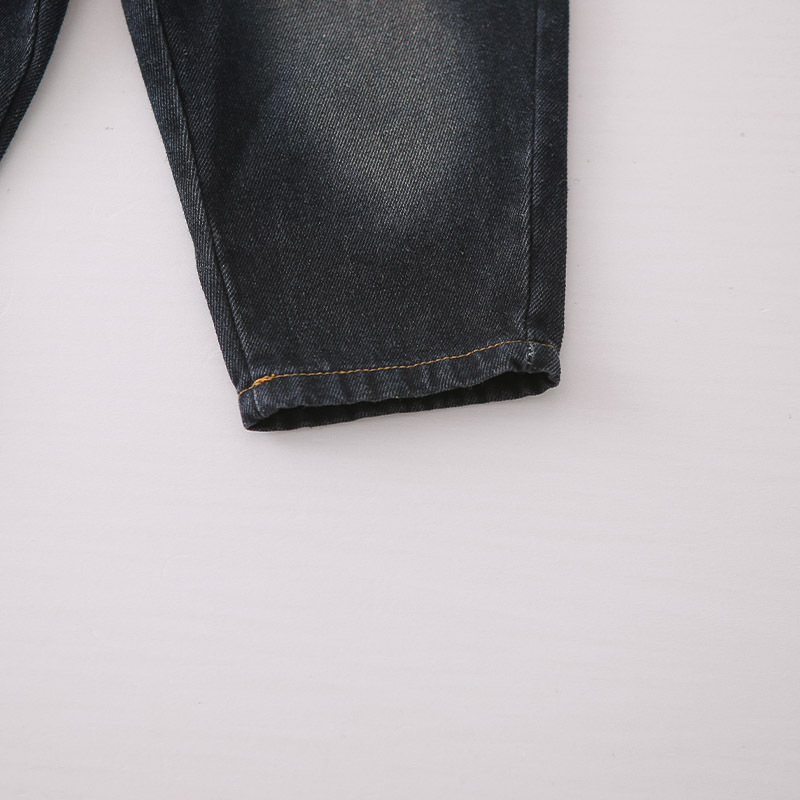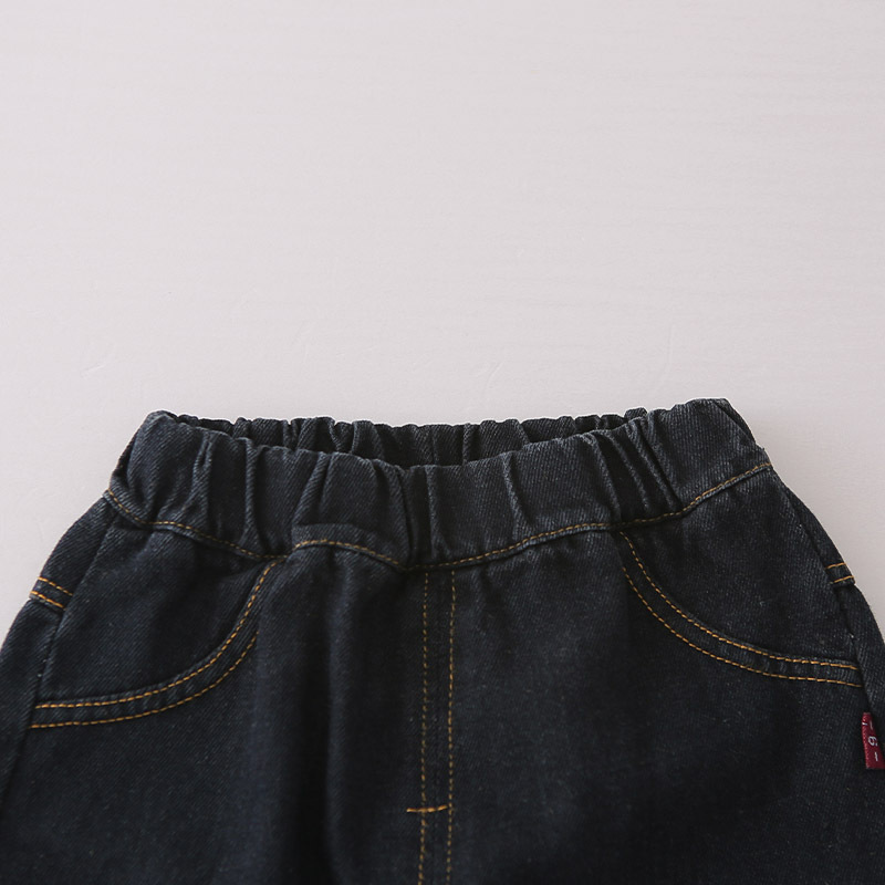 – Панталон от тъмносин деним с еластична талия, удобна кройка и леки декоративни кръпки за допълнителен стил.