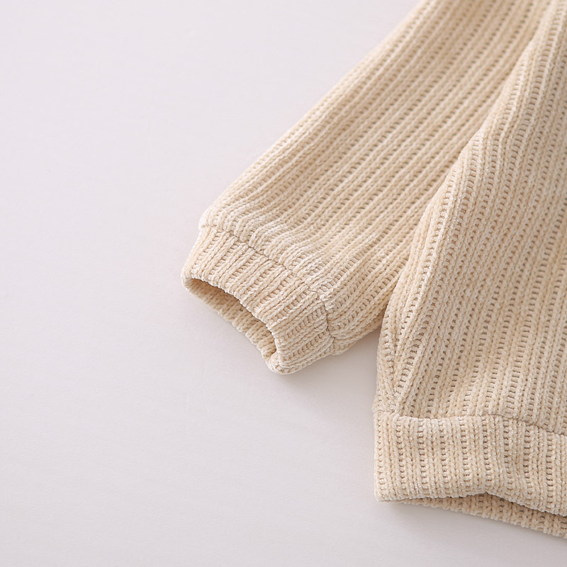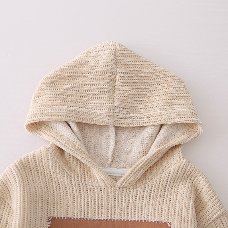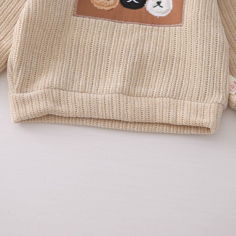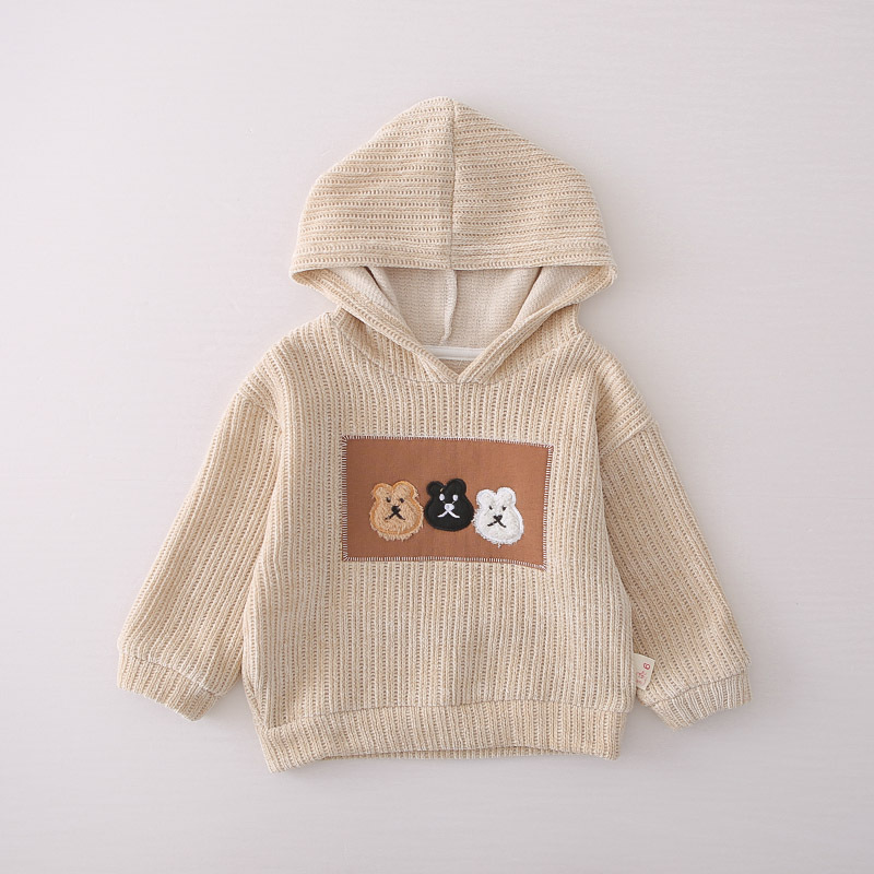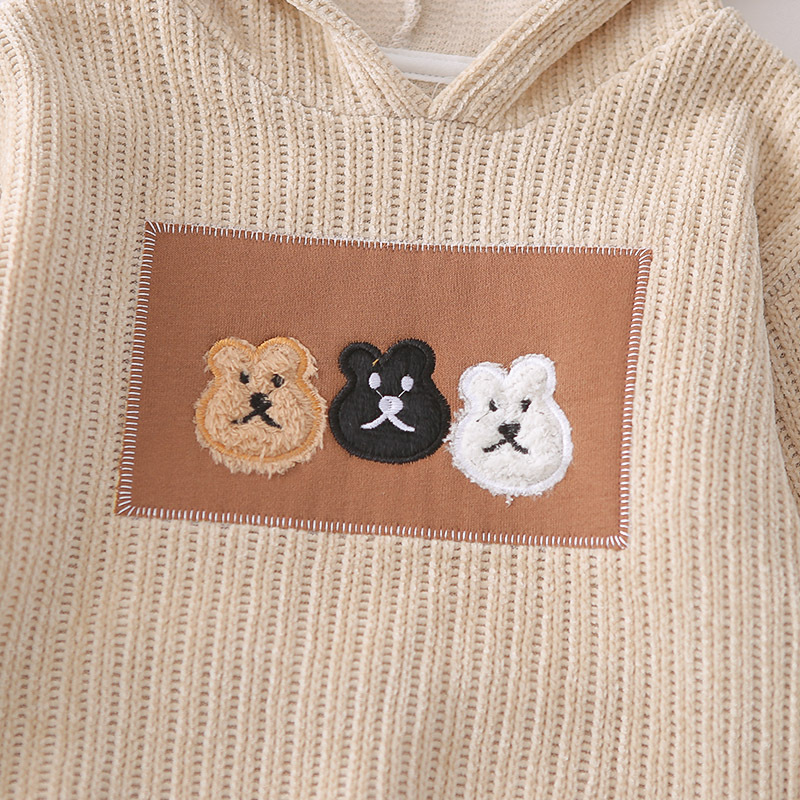– Суитшърт с качулка, изработен от меко плетено кадифе в бежов цвят. Декориран е с контрастна кафява апликация с три усмихнати мечета, които добавят игрив акцент.