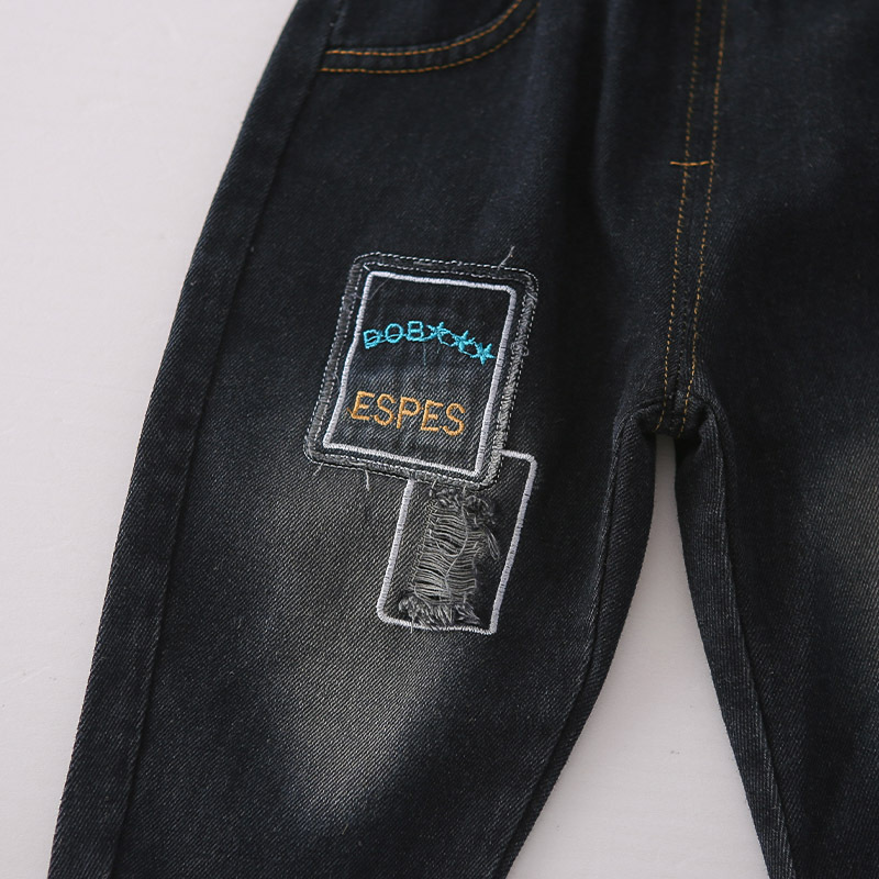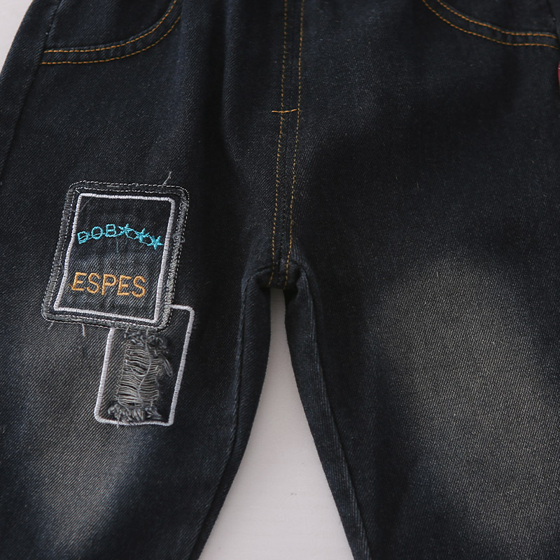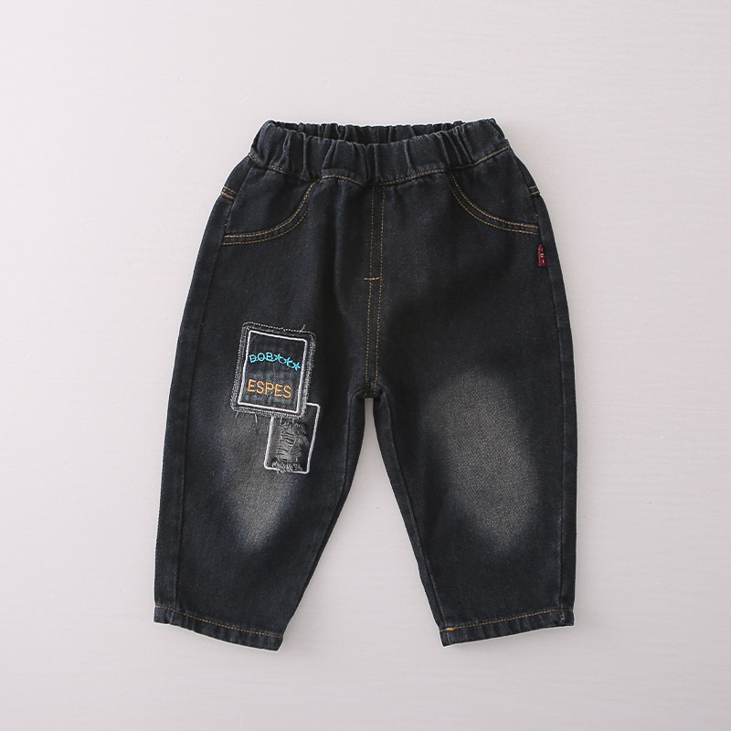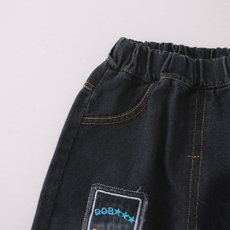 – Панталон от тъмносин деним с еластична талия, удобна кройка и малки декоративни кръпки за допълнителен стил.