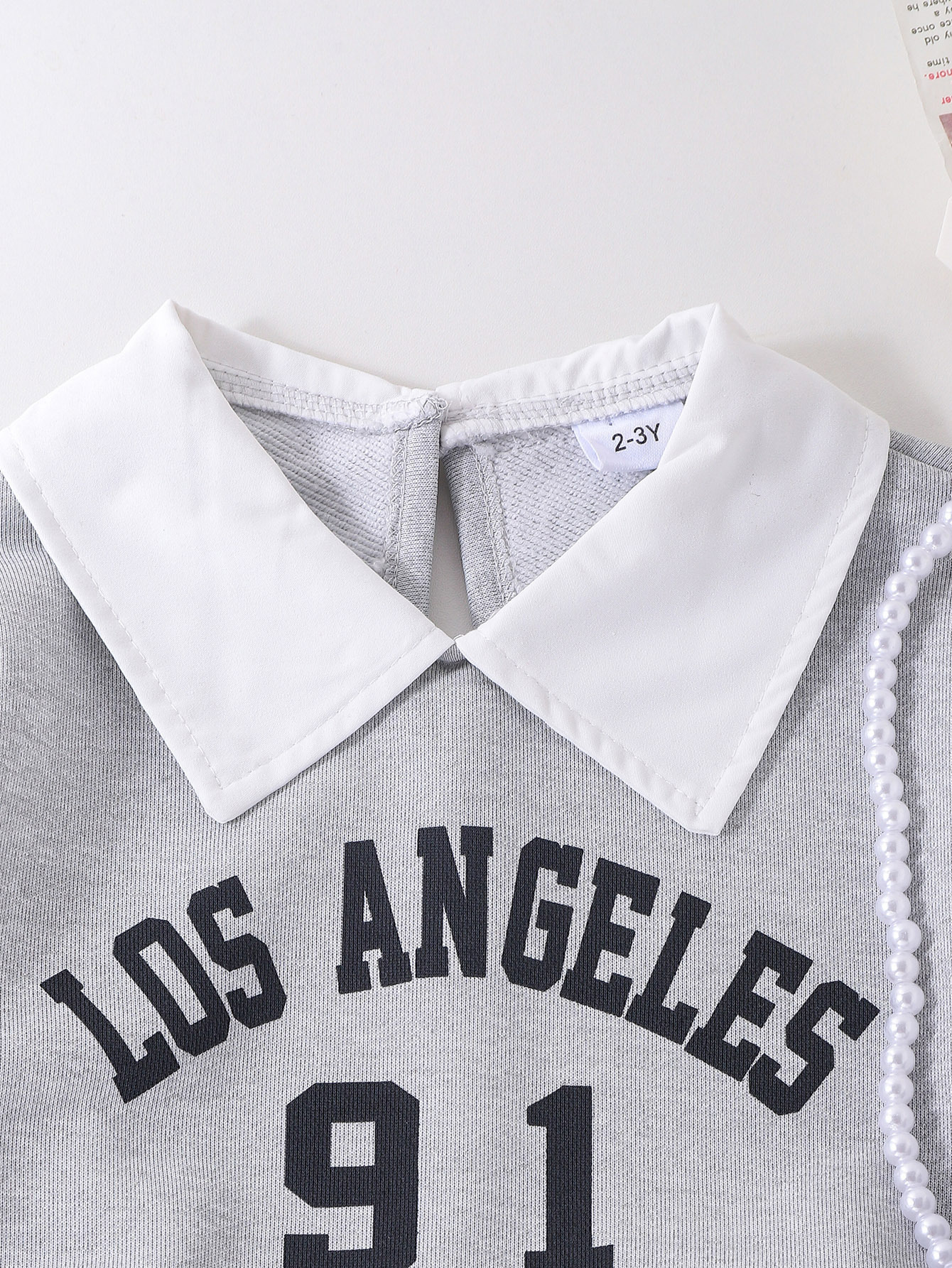 – Суитшърт в меланж светлосиво, от висококачествена материя с бяла класическа яка тип “риза”. Обло деколте, дълги ръкави с рипсени маншети и долен подгъв – за комфортно прилягане. Декоративен принт “Los Angeles 91” в тъмен нюанс отпред.