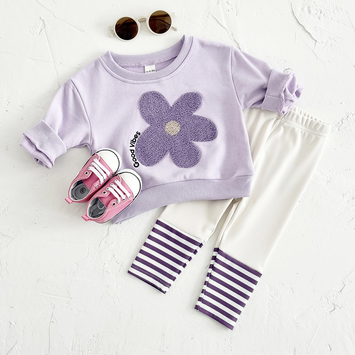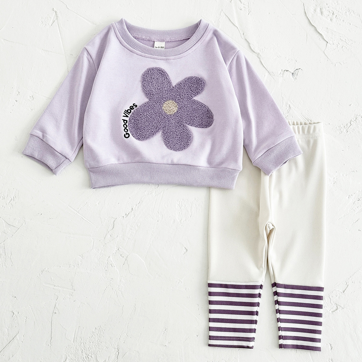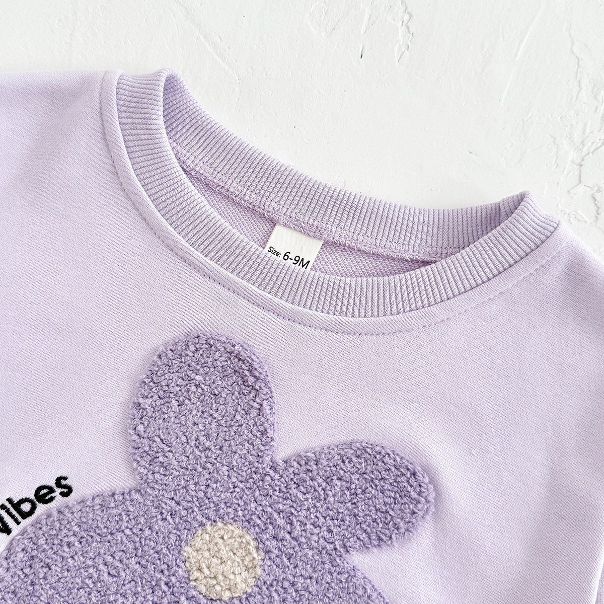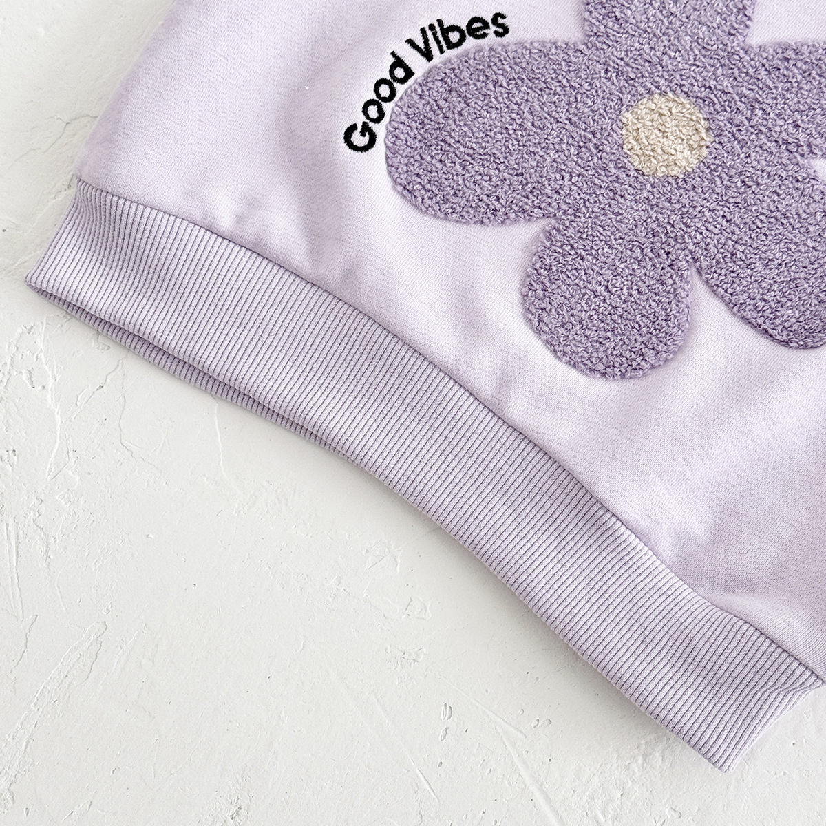 – Суитшърт в пастелнолилаво от висококачествена памучна материя. Обло деколте, дълги ръкави с рипсени маншети и долен подгъв. Централна плюшена апликация „цвете“ и надпис „Good Vibes“ за игрив акцент.