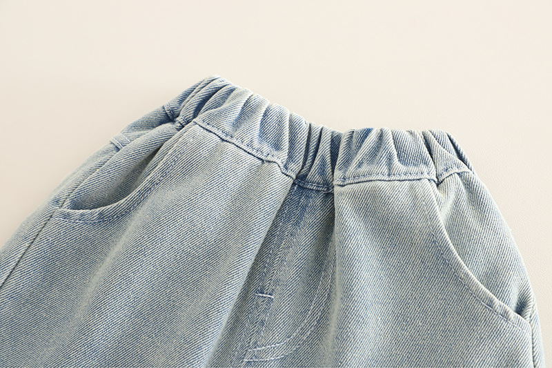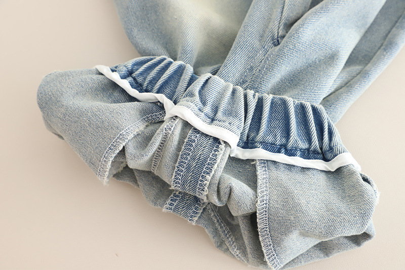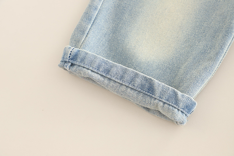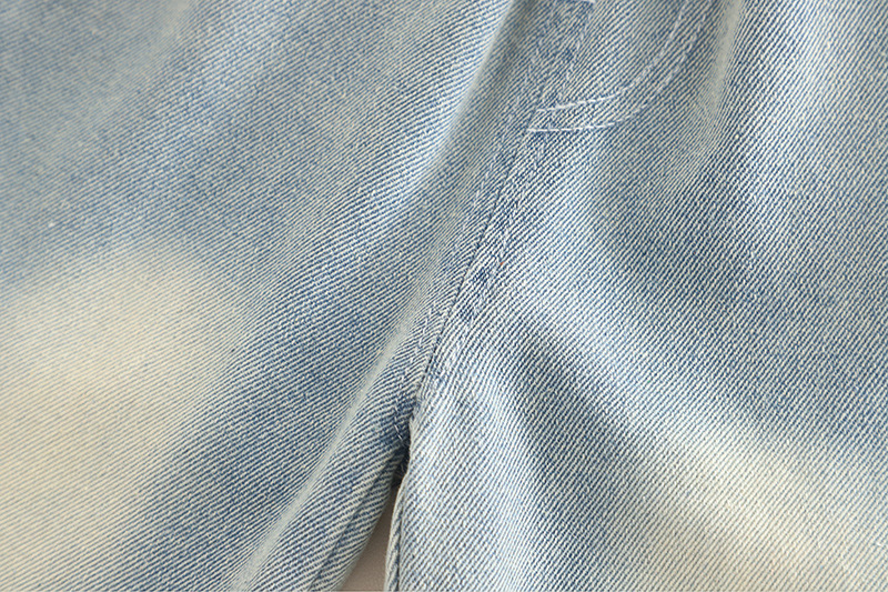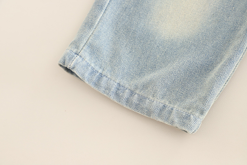 -Дънков панталон с избелен ефект, изработен от мек деним. Кройката е свободна, крачолите са леко навити, а дизайнът съчетава непринуден стил с удобство за ежедневни игри.