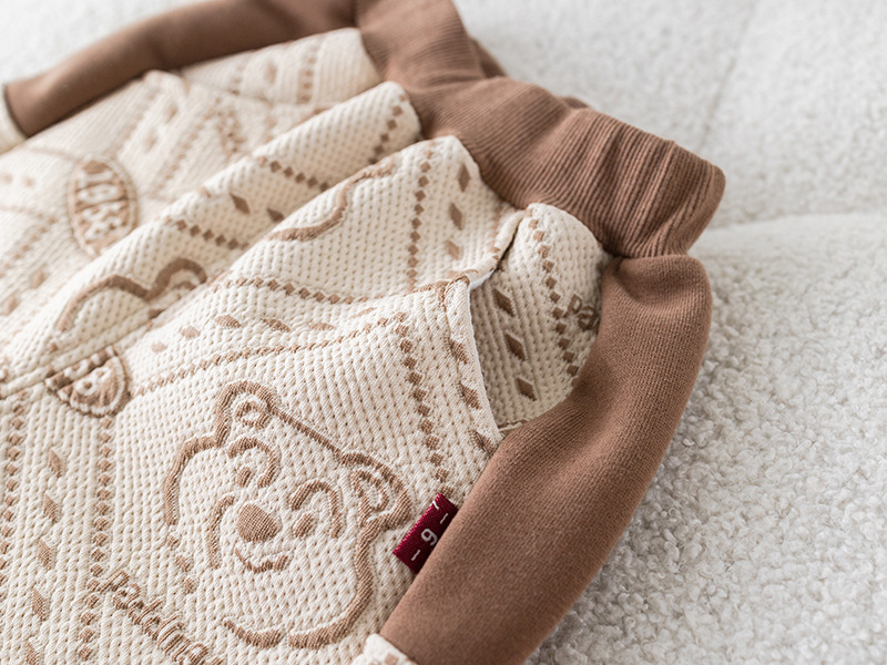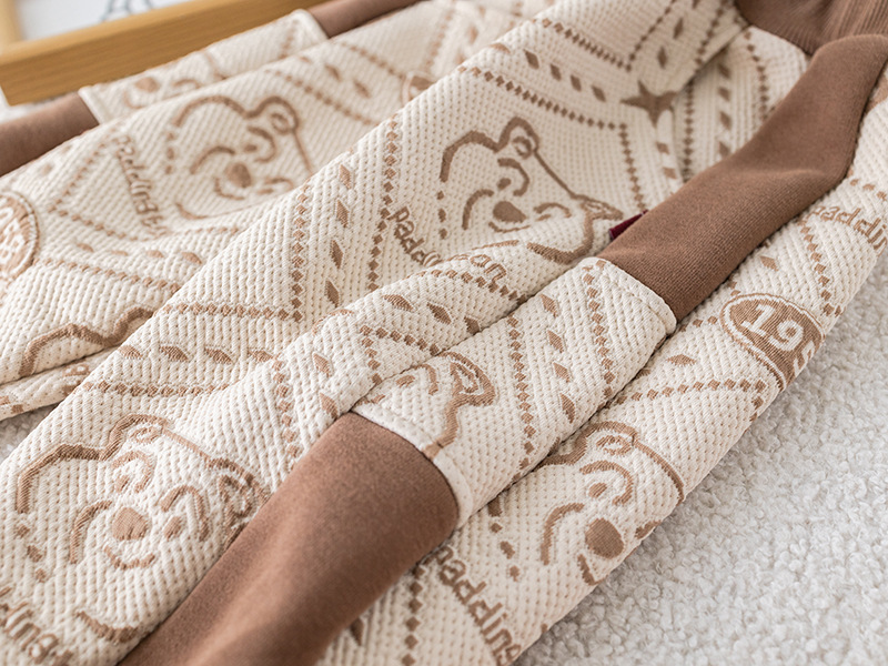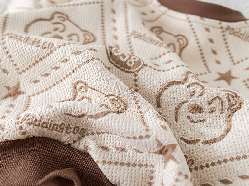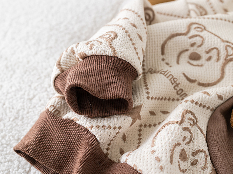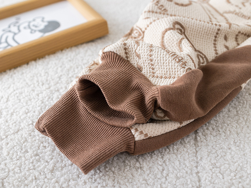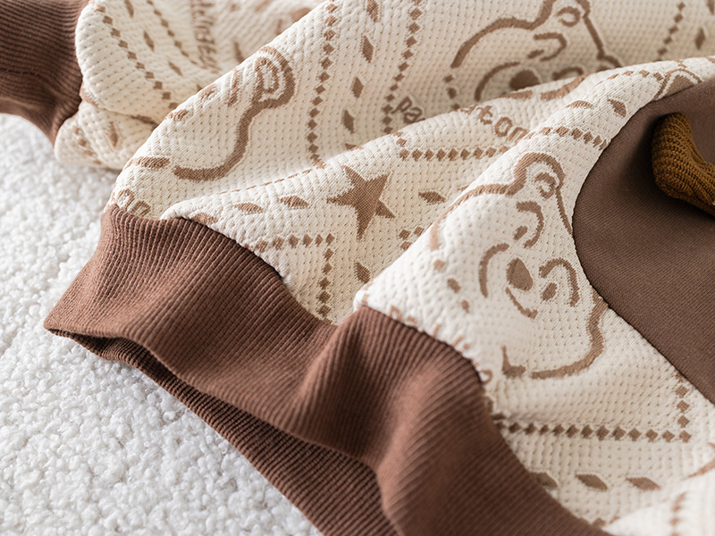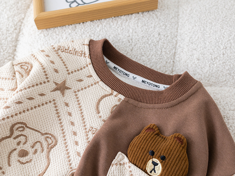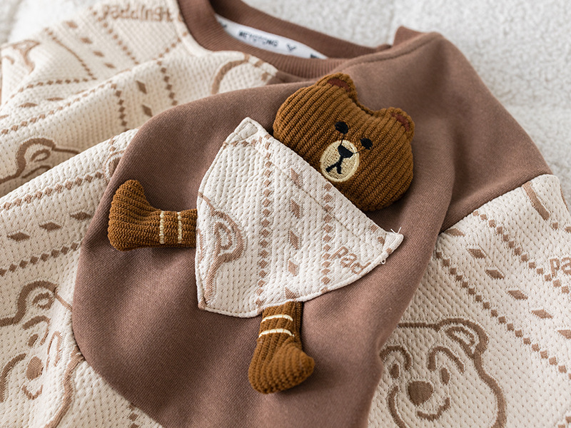 – Блуза с дълъг ръкав, изработена от памучна материя с релеф в шоколадово и бяло, с контрастен дизайн. Декорирана е с модерен принт на мечета и добавен 3D плюшен мечо елемент в предната част за игрив и уникален вид. Ластични маншети и обло деколте осигуряват комфорт през целия ден.