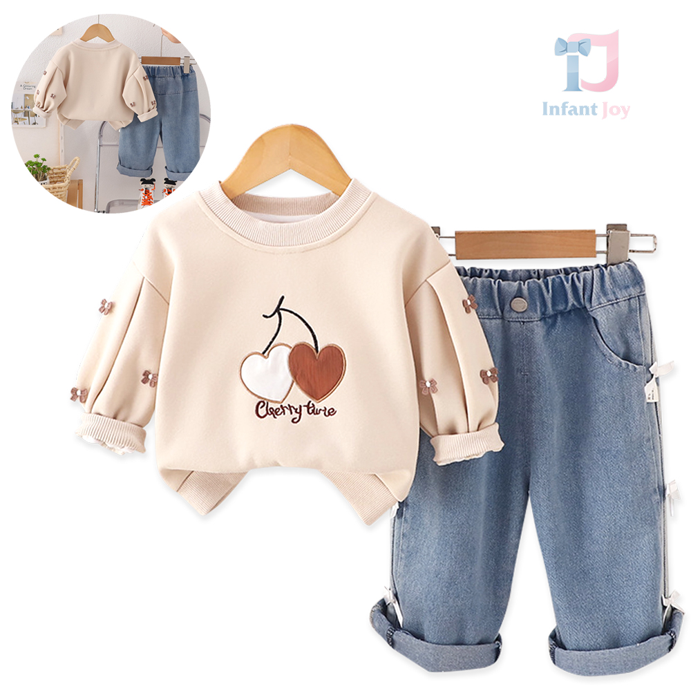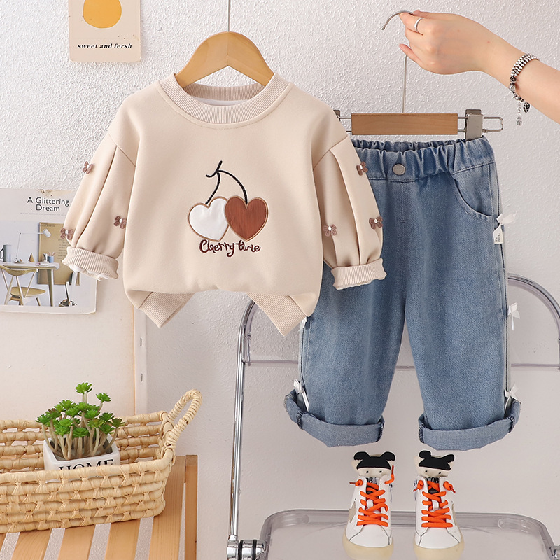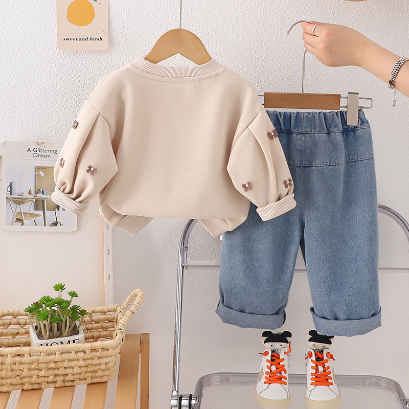 Комплект от Блузка/Суитшърт с 3Д Панделки и Дънков Панталон Cherry Ribbon – 2 части