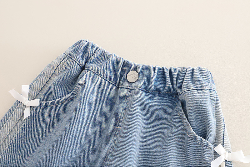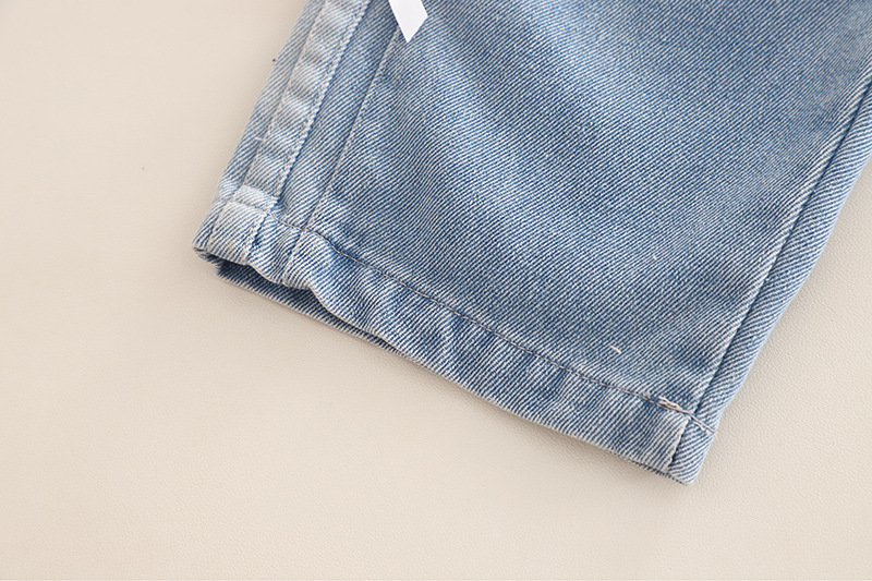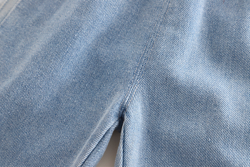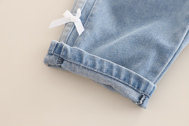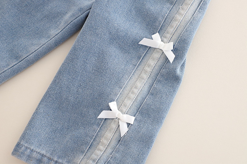 – Дънков панталон в средно син деним с еластична талия и метално тик‑так копче за лесно обуване. Два функционални странични джоба и ред от малки бели 3D панделки по външния шев на крачолите. Навити маншети на глезените за свобода на движение.