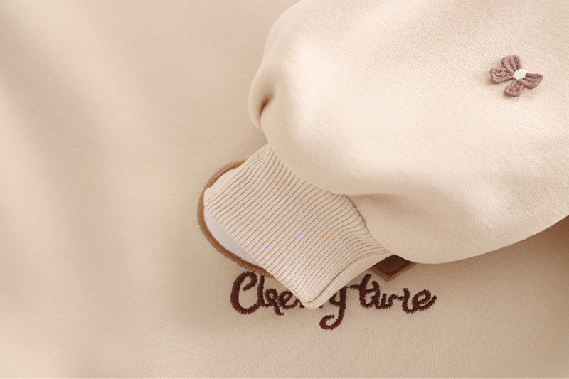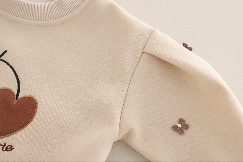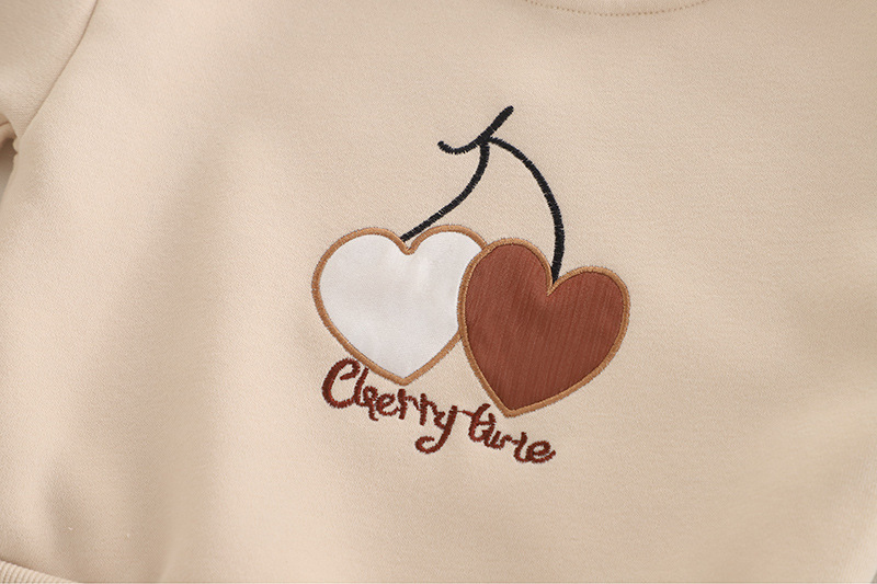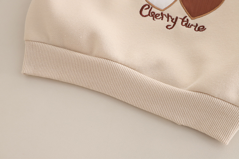 – Суитшърт в кремаво-кафяво от висококачествен памучен плат с обло деколте. Обемни буфан ръкави с ластични маншети и 3D апликации “панделки” в същия нюанс, разположени равномерно по ръкавите. Централна бродерия “Cherry time” с две сърцеподобни черешки – едната в бяло, другата в топло кафяво.