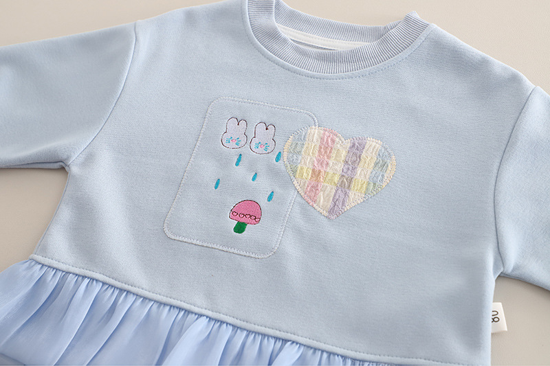 – Блузка/Туника от мека памучна материя. Модел със свободна кройка и дълги ръкави с подгънати маншети. В долната част са добавени ефирни къдри от органза за ефект. Предната част е декорирана с апликации: бродирани зайчета, сърце от каре плат и елементи, наподобяващи капчици и гъбка.