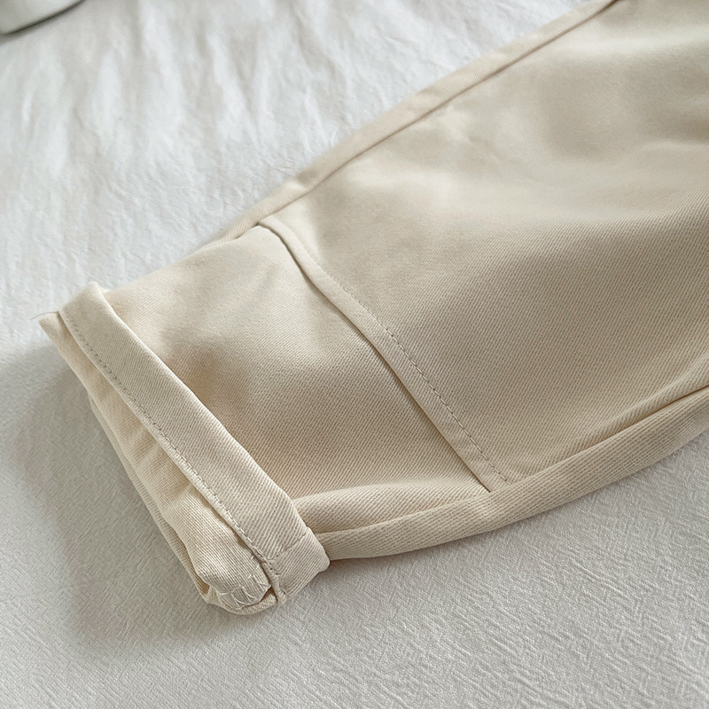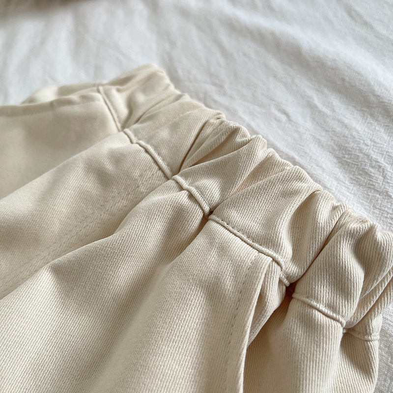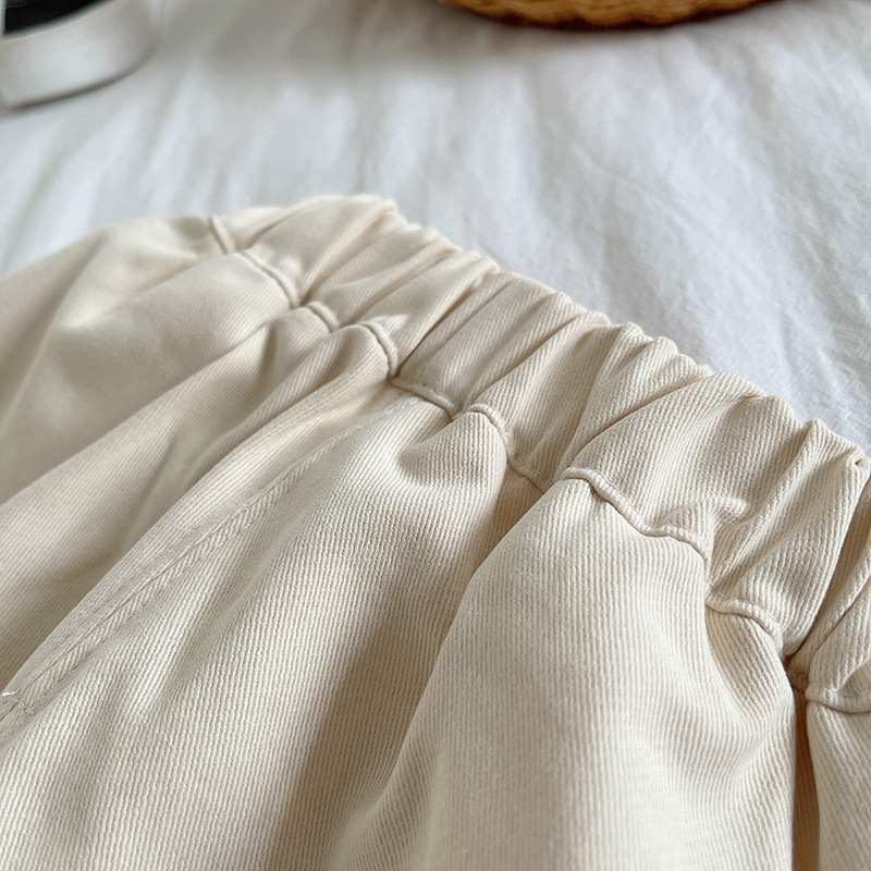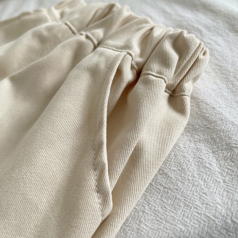 – Панталон в кремаво от мека памучна материя с еластична талия за бързо обуване, два странични джоба и прав подгъв за изчистен силует.