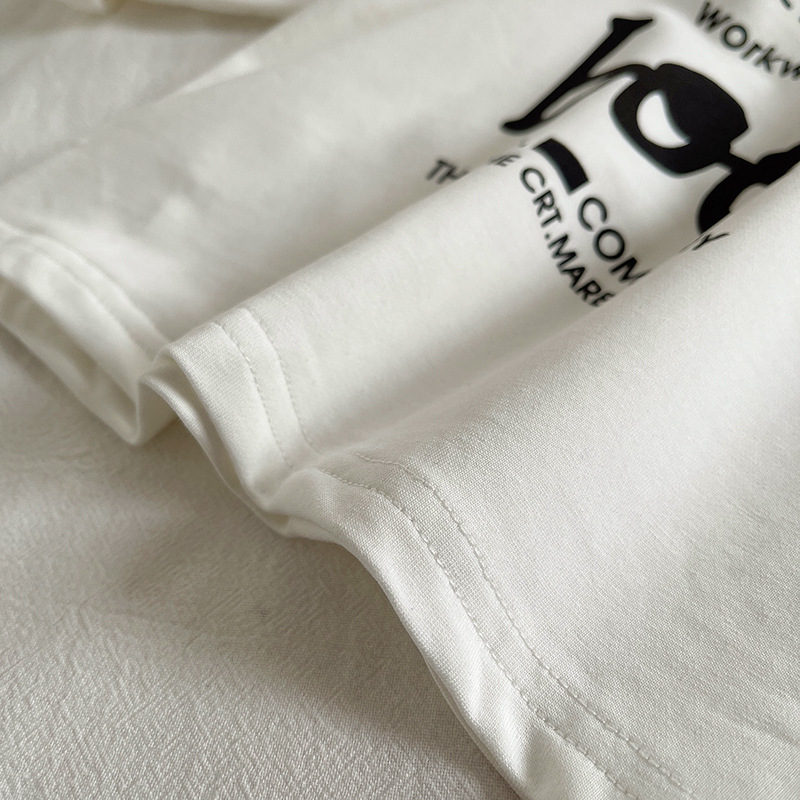 – Блузка в бяло с черни щампирани надписи отпред, стандартна кройка за лесно комбиниране с други аутфити.