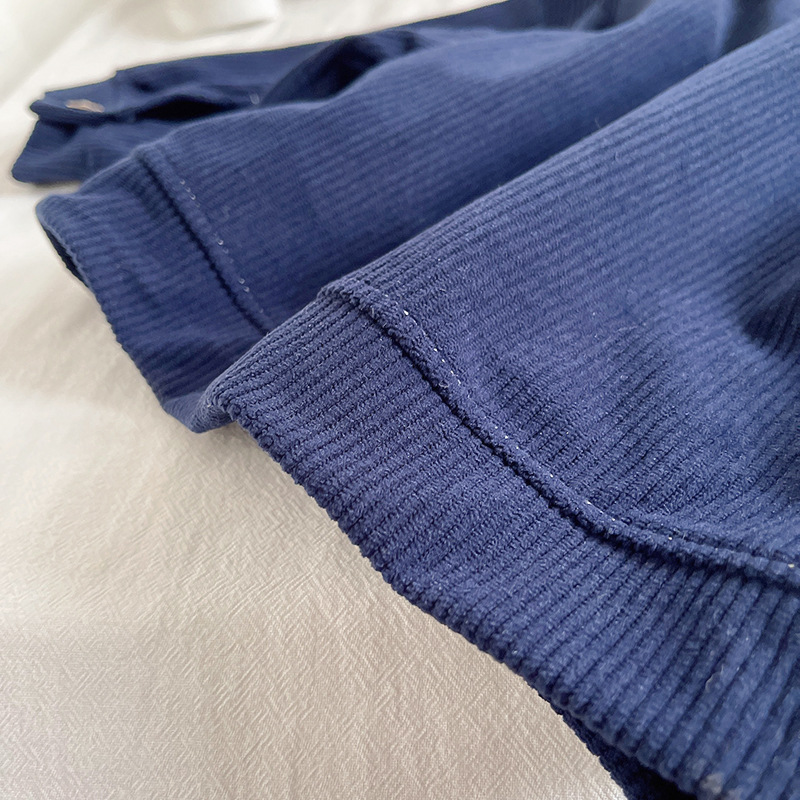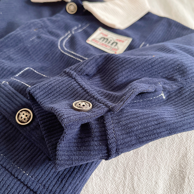 – Джинсово яке-бомбър в тъмносин цвят с контрастна ванилова яка, закопчаване посредством копчета, два предни джоба и малка бродирана емблема от едната страна.