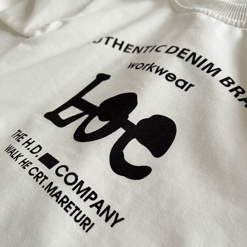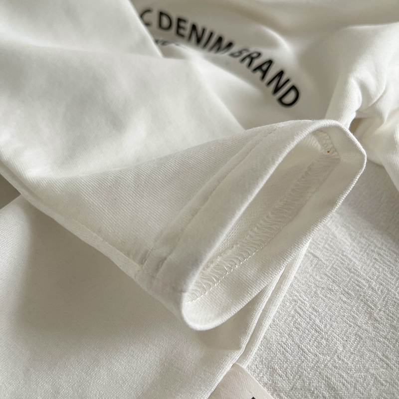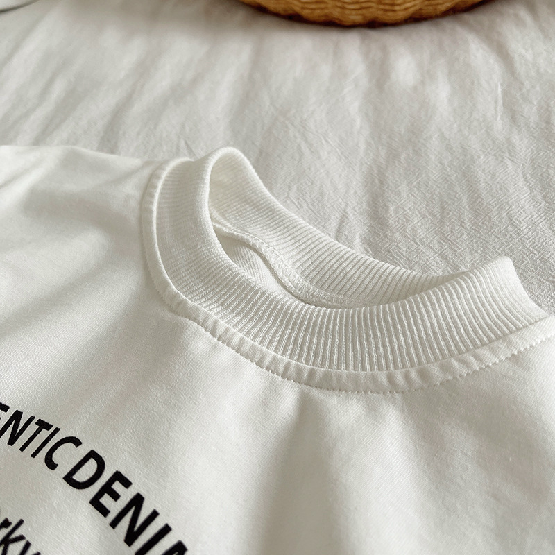 – Памучна блузка в бяло с черни щампирани надписи отпред, стандартна кройка за лесно комбиниране с други аутфити.