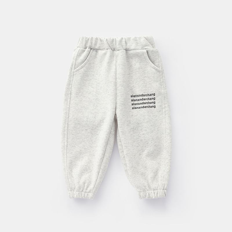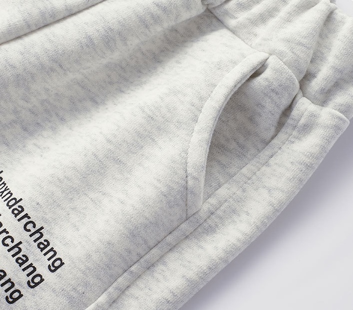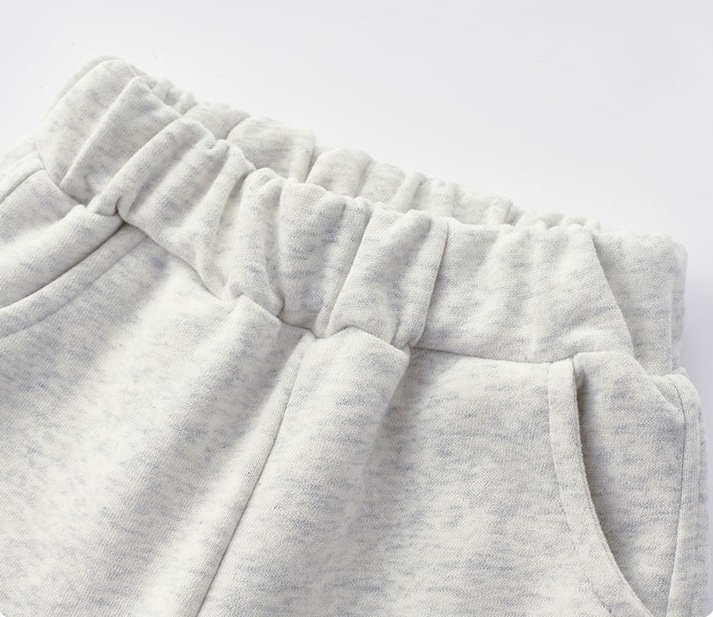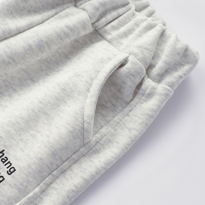 – Спортен панталон в светлосив меланж от мека памучна материя. Еластична талия за лесно обуване, два странични джоба и декоративен принт на бедрото. Еластични маншети при глезените за свобода на движение.