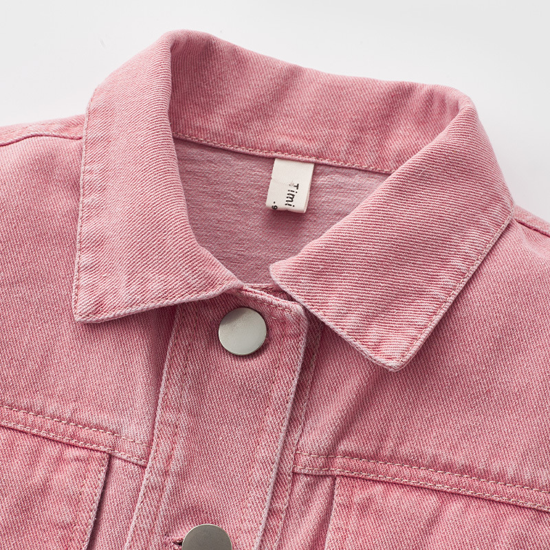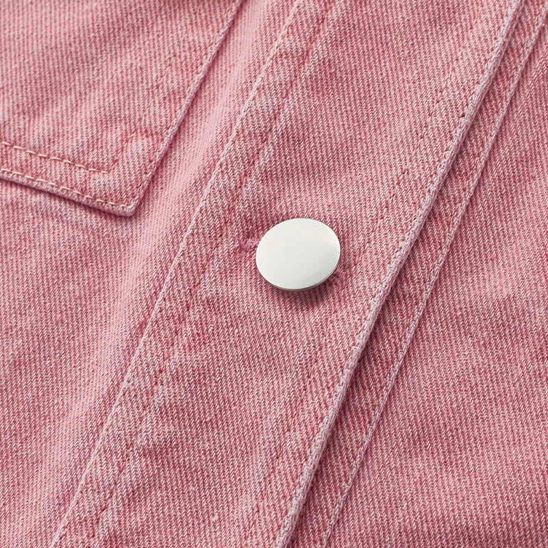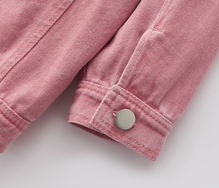 – Яке от висококачествен, мек деним в пастелнорозово с класическа яка. Закопчаване със сребристи тик-так копчета, два предни джоба с капаци и права кройка.