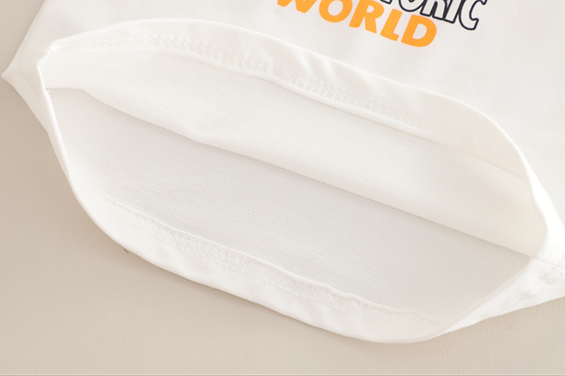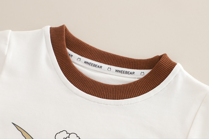– Бяла, памучна блузка с щампа и контрастен кафяв рипсен кант на яката. Щампата отпред представя изригващ вулкан и надпис – за малки изследователи с въображение.