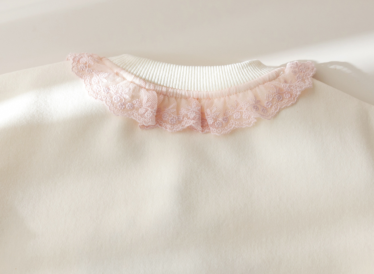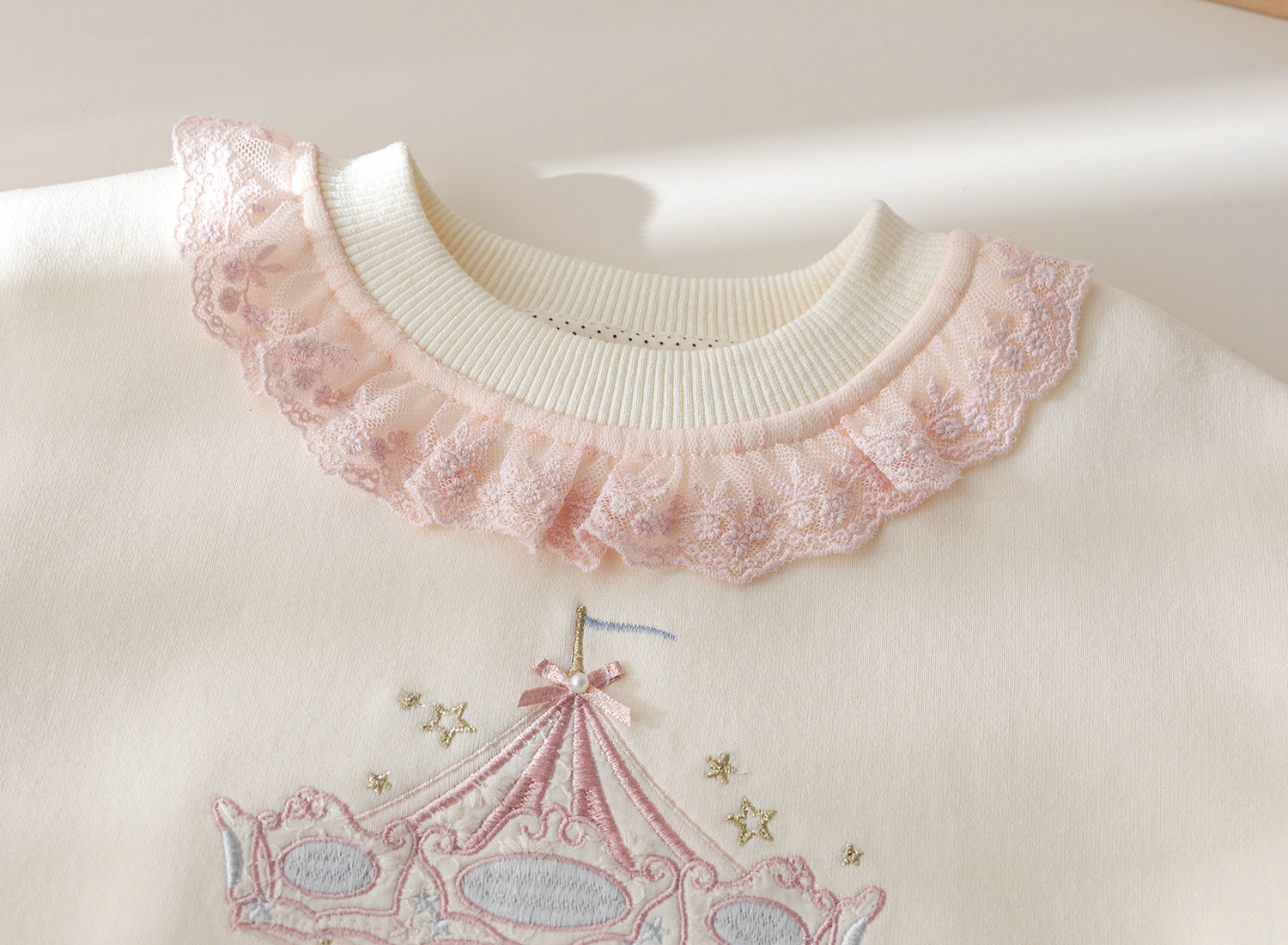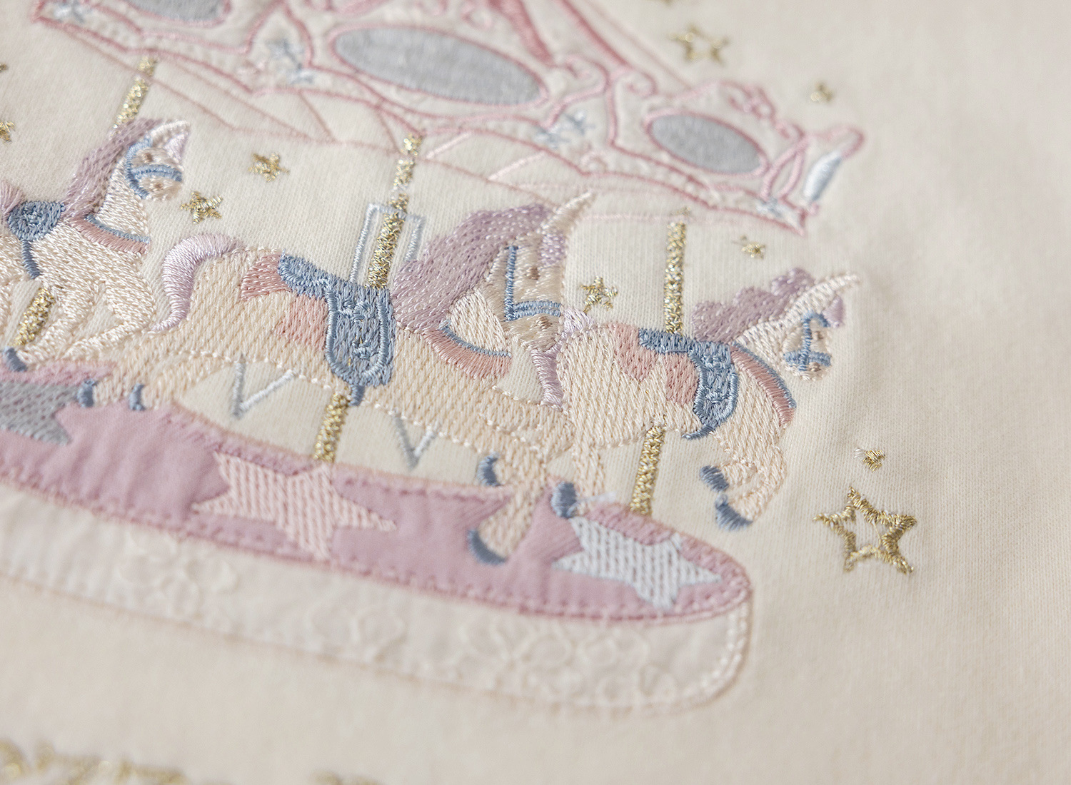 – Кроп блузка/суитшърт, изработена от мека и приятна на допир материя в млечно-кремав цвят. Декорирана е с приказна бродерия на въртележка с кончета + нежни дантелени къдри около деколтето и по ръкавите. Фин блясък и деликатни детайли придават романтично и момичешко излъчване.