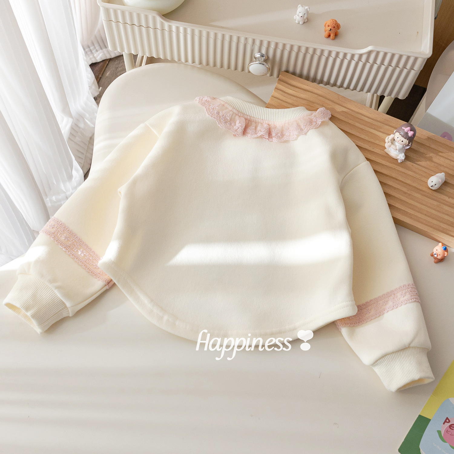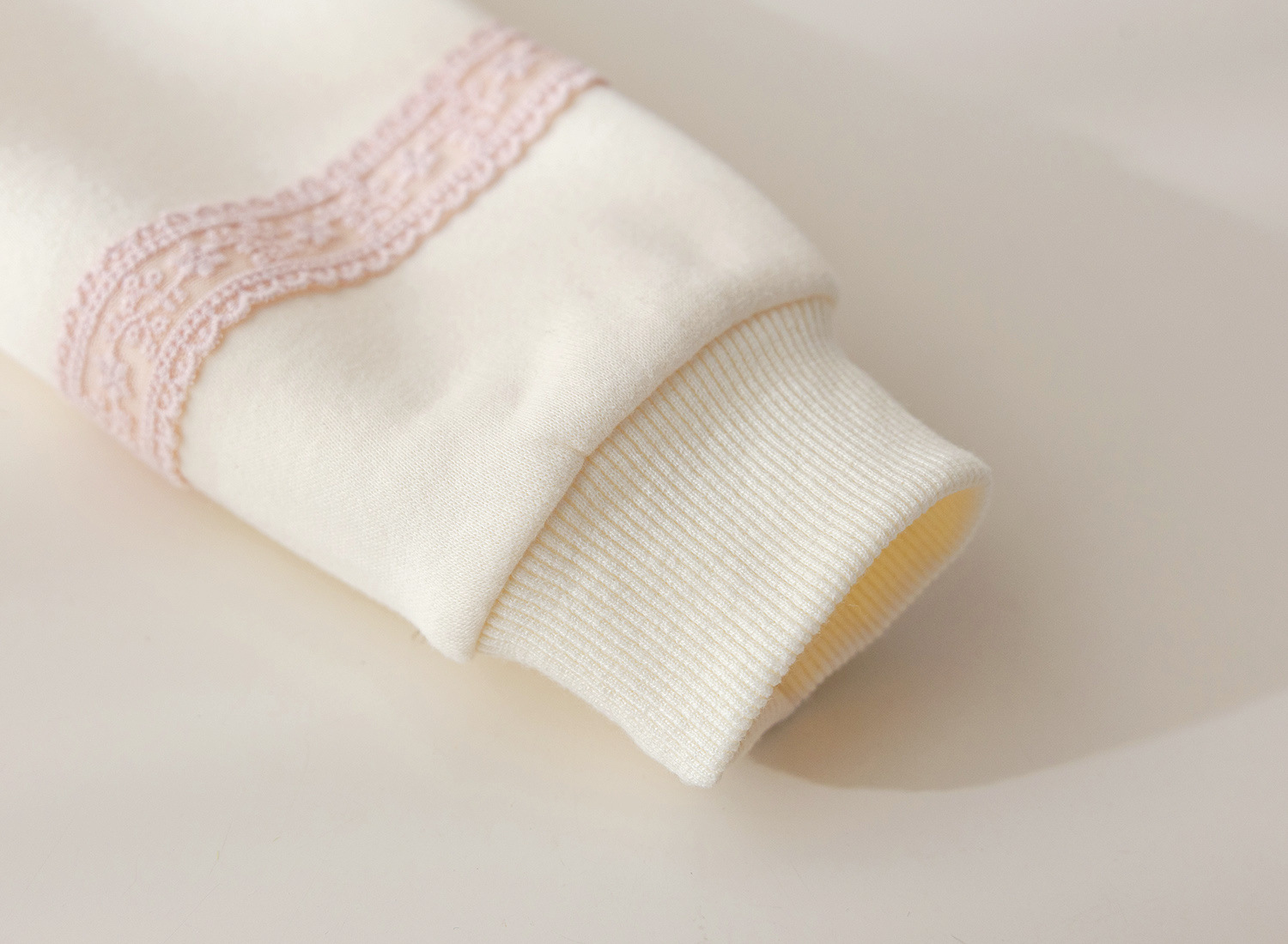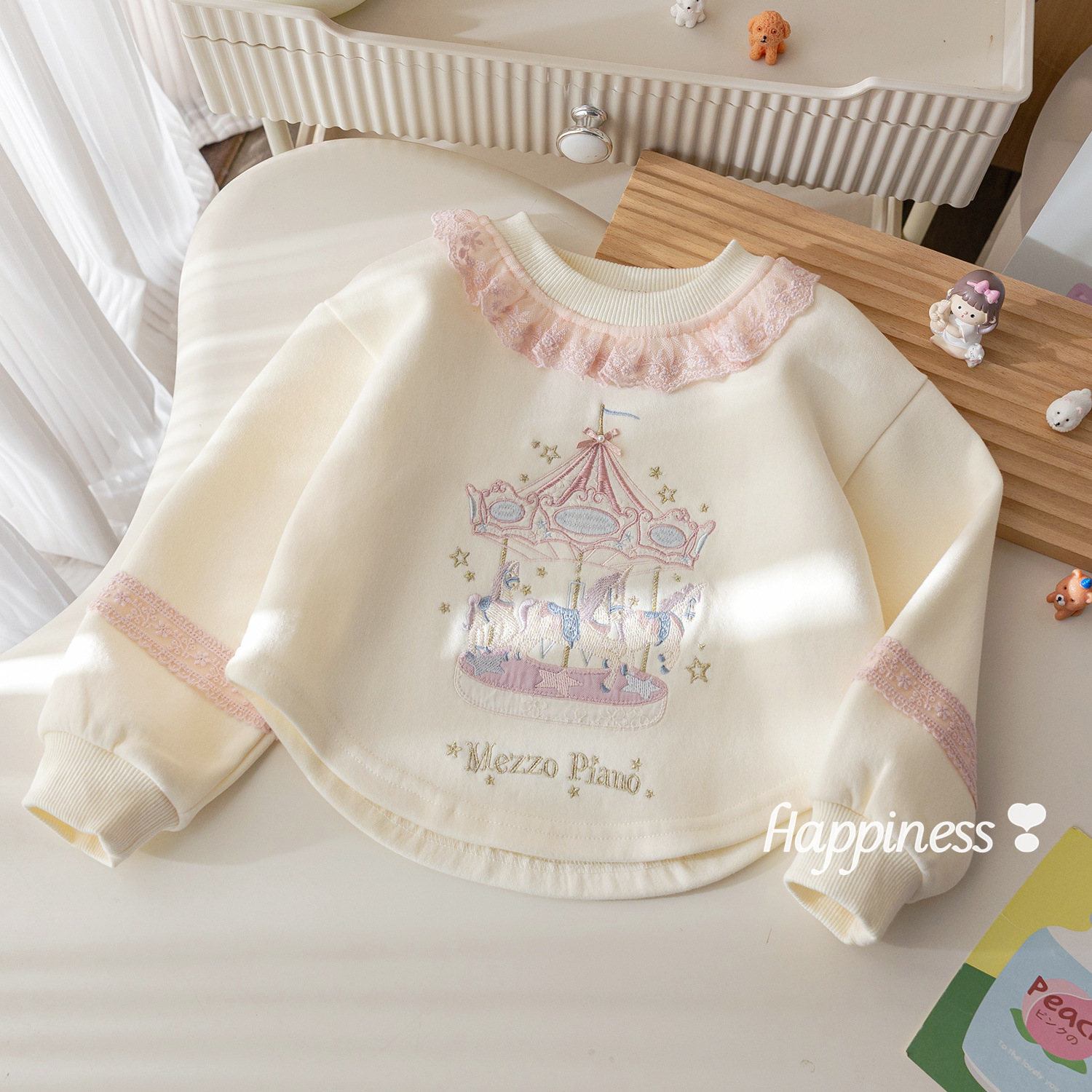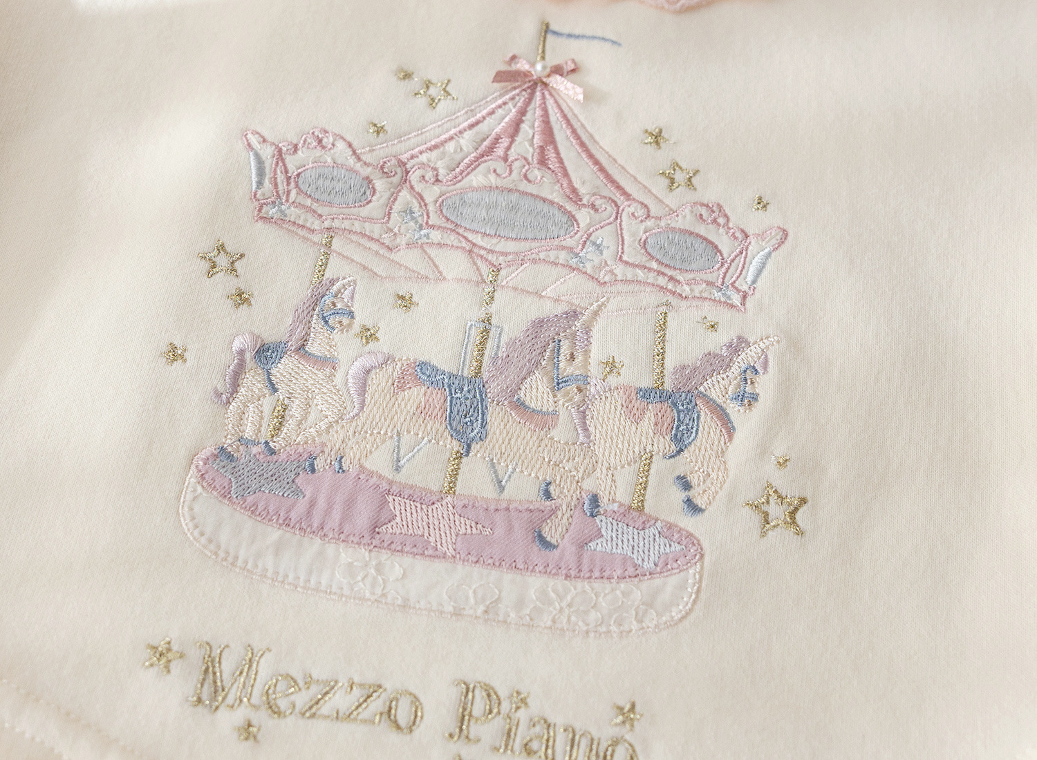 – Кроп блузка/суитшърт, изработена от мека и приятна на допир материя в млечно-кремав цвят. Декорирана е с приказна бродерия на въртележка с кончета + нежни дантелени къдри около деколтето и по ръкавите. Фин блясък и деликатни детайли придават романтично и момичешко излъчване.
