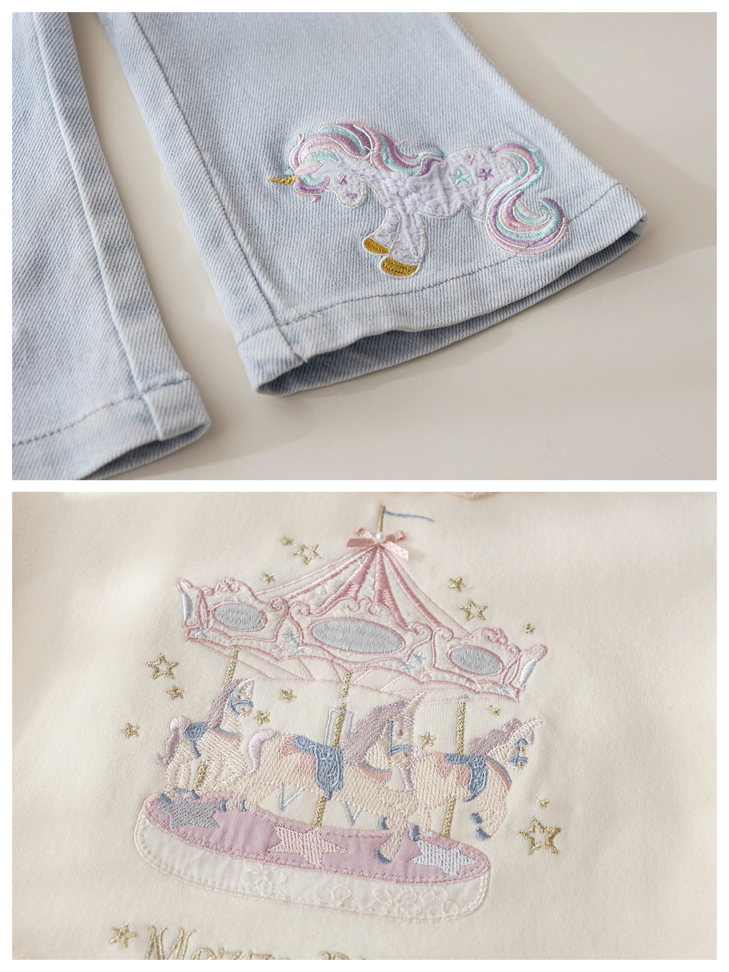 – Дънков панталон, изработен от деним в светлосин цвят с права кройка. Декориран с красиви бродерии – еднорог и панделка, които добавят игривост и стил. Ластичната талия осигурява удобство при носене.