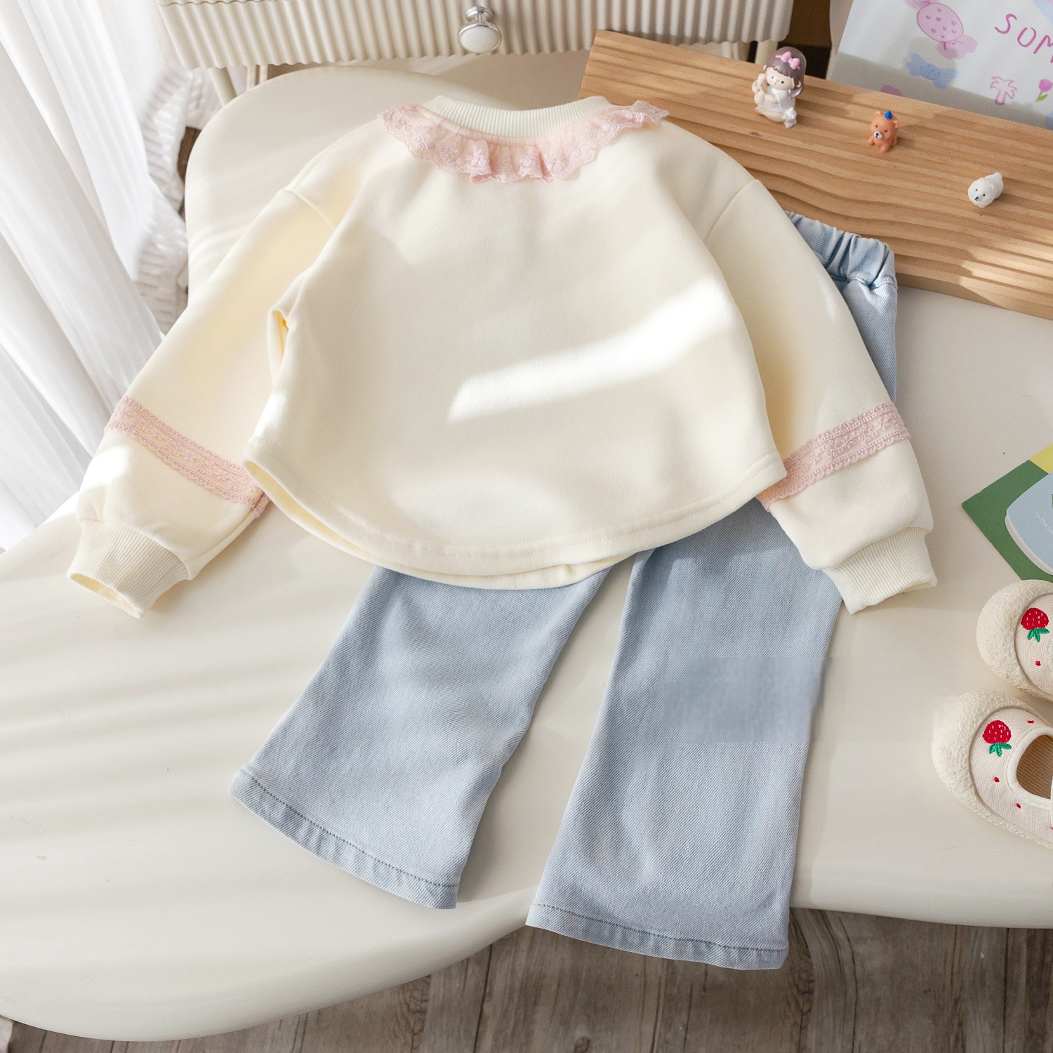 Комплект от Кроп Блузка/Суитшърт с Буфан Ръкав и Дънкови Панталони с Бродерии Fun Park – 2 части