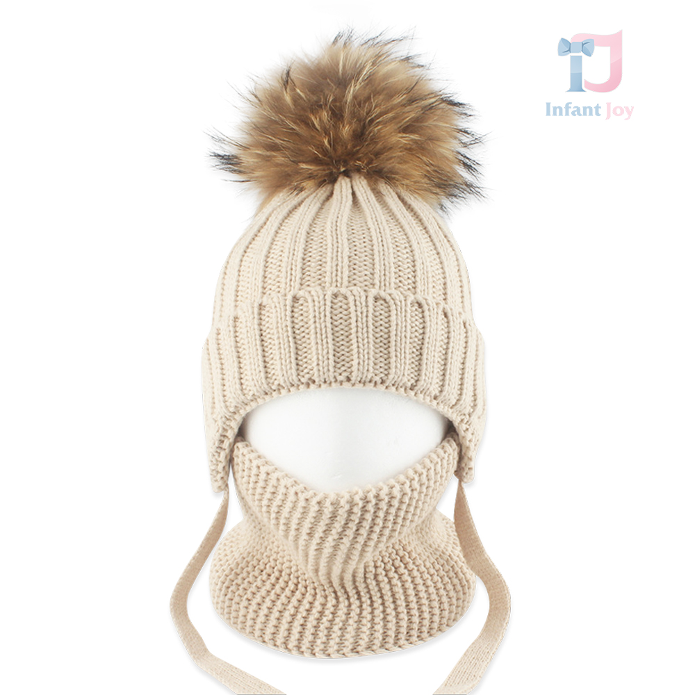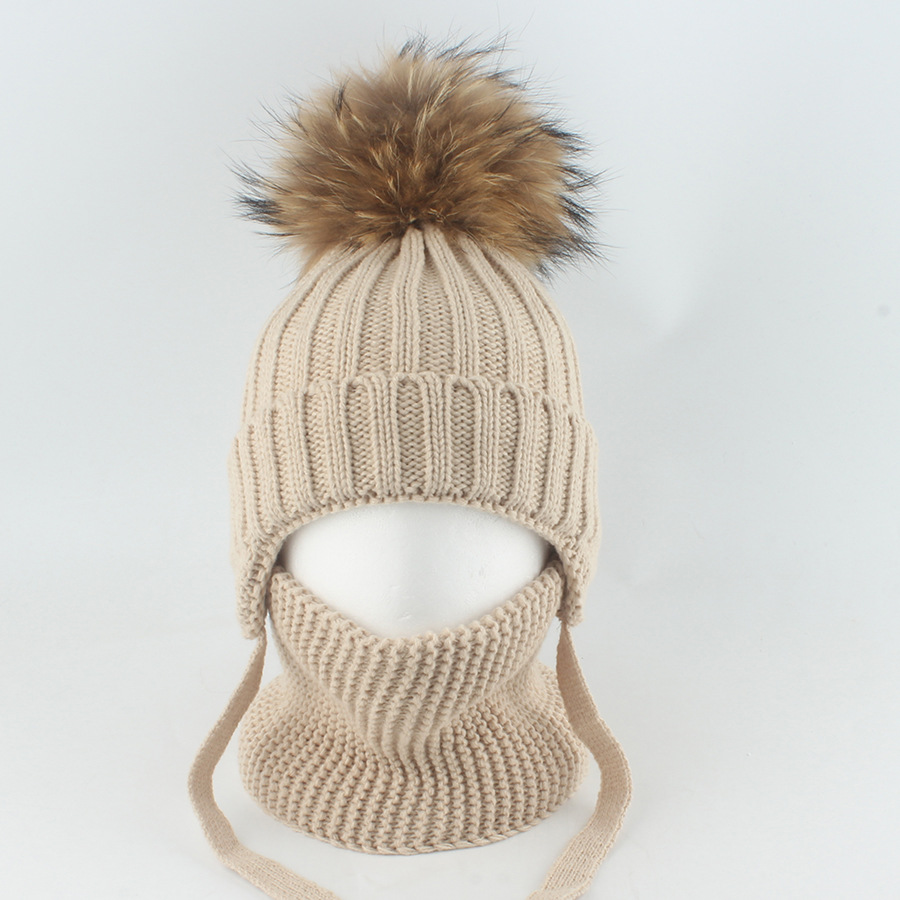 – Вълнена шапка с естествен помпон в бежов цвят. Изработена от топла вълна за максимална защита от студа. Добавено пухче с естествен косъм (енот), което се сваля от шапката посредством метално копче. Моделът е с универсален размер за бебета и деца с обиколка на главата 48–54 см (6 мес.–5 год.).