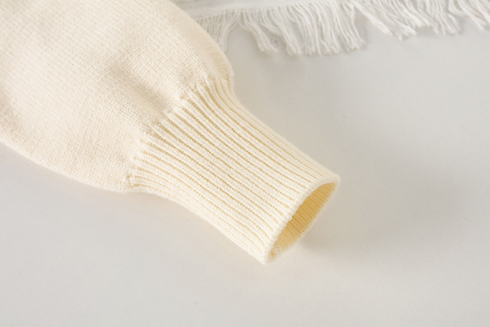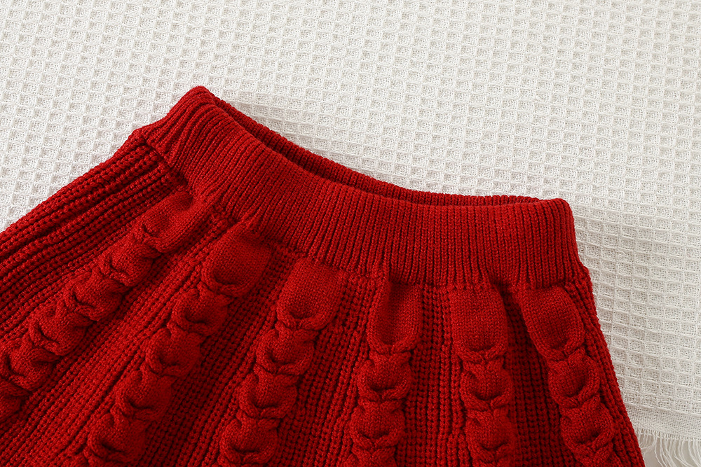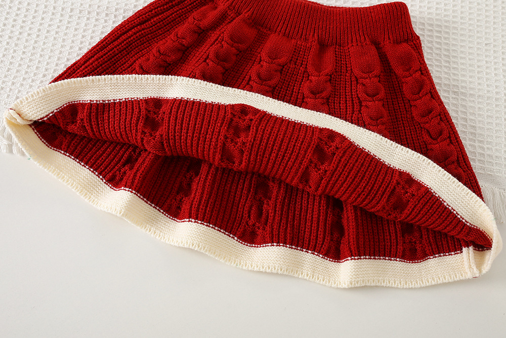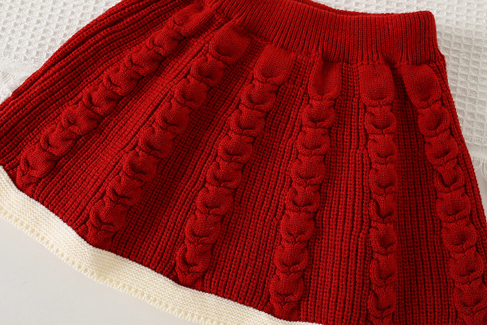 – Плисирана пола – от същото плетиво и цвят като топа, създавайки перфектен комплект. Има деликатен, контрастен кант в кремаво, който хармонира с пуловера.