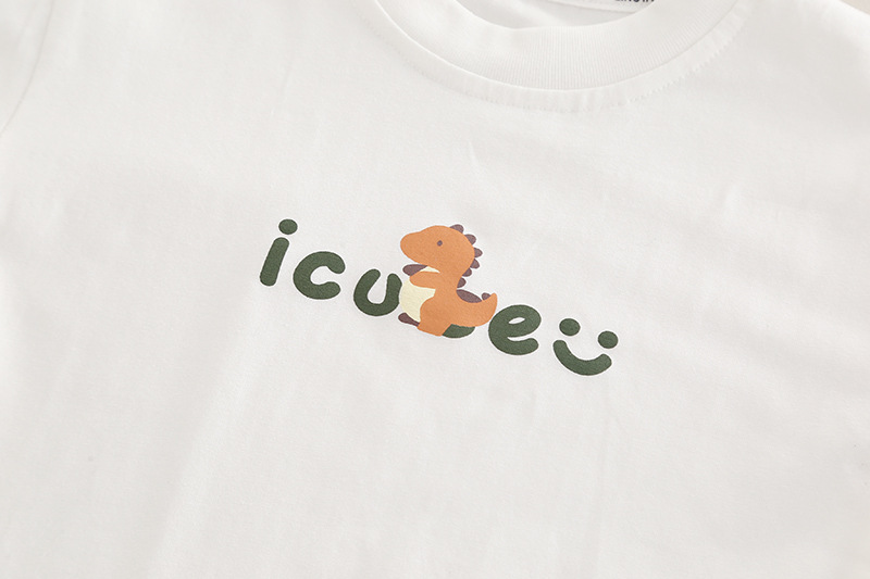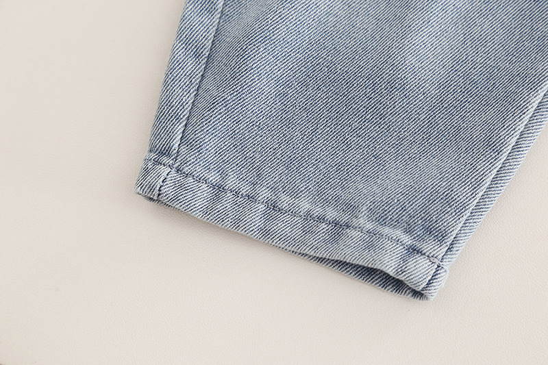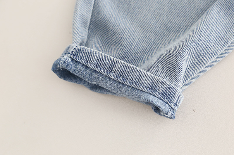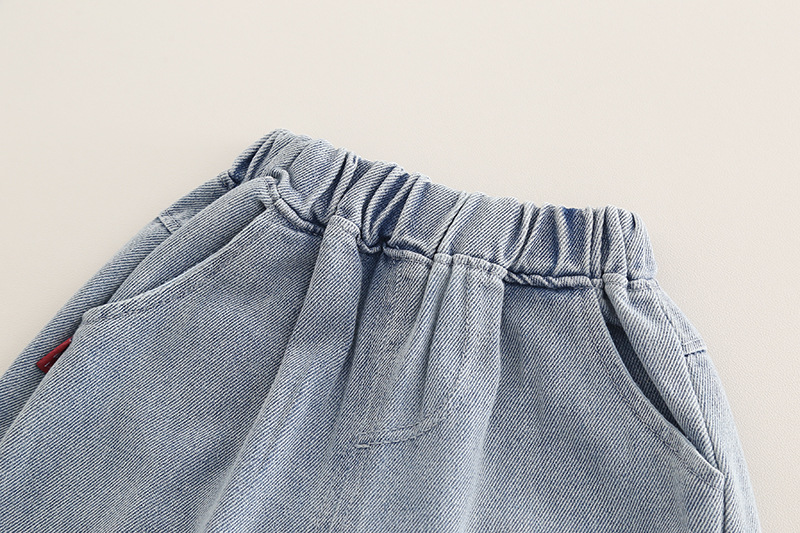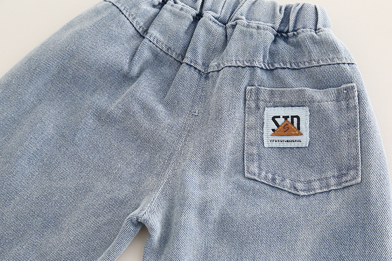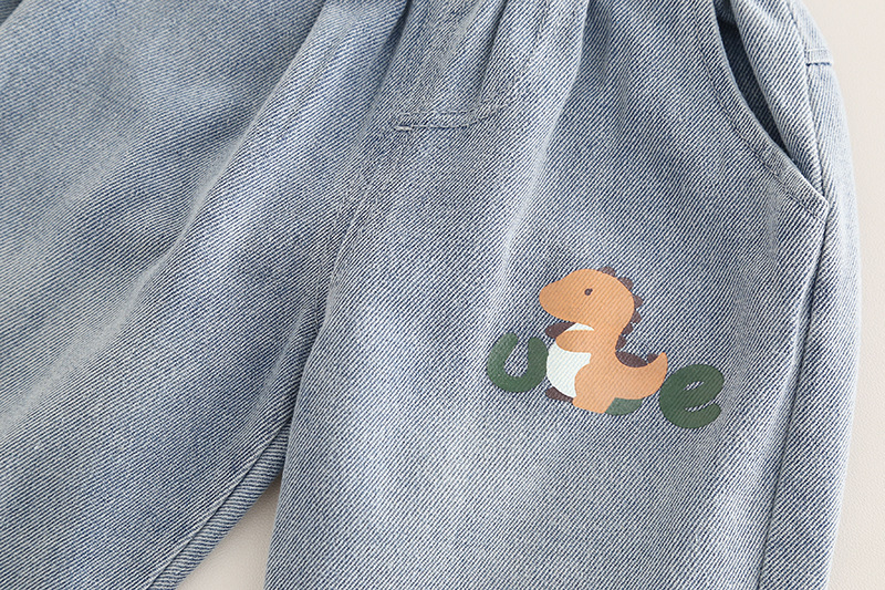 – Дънков панталон в средно син деним с еластична талия за лесно обличане и два странични джоба. Навити крачоли, декорирани с апликация на динозавър и надпис.