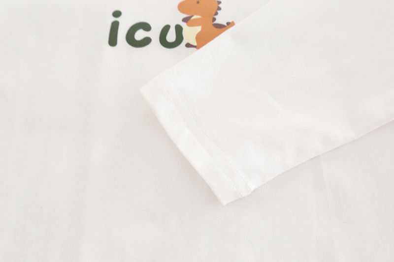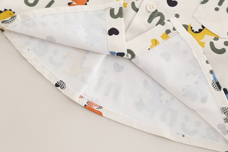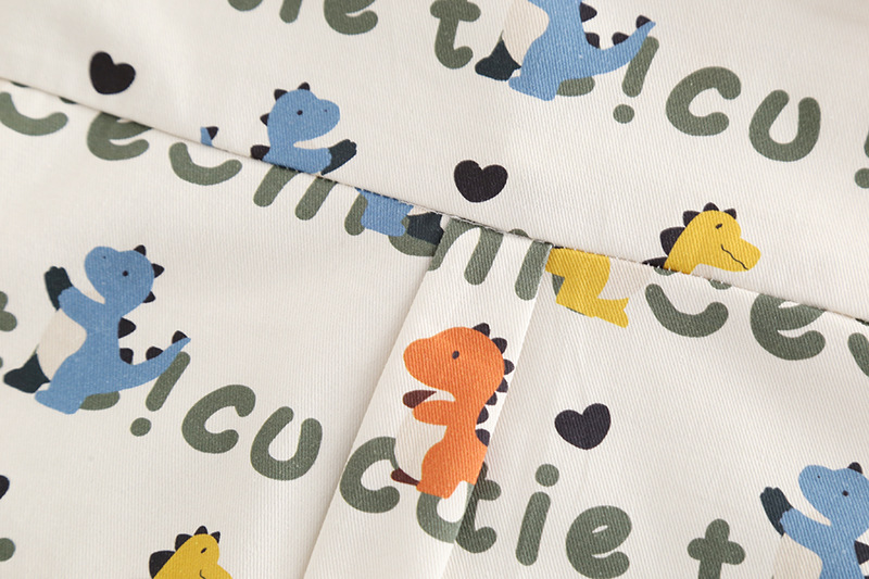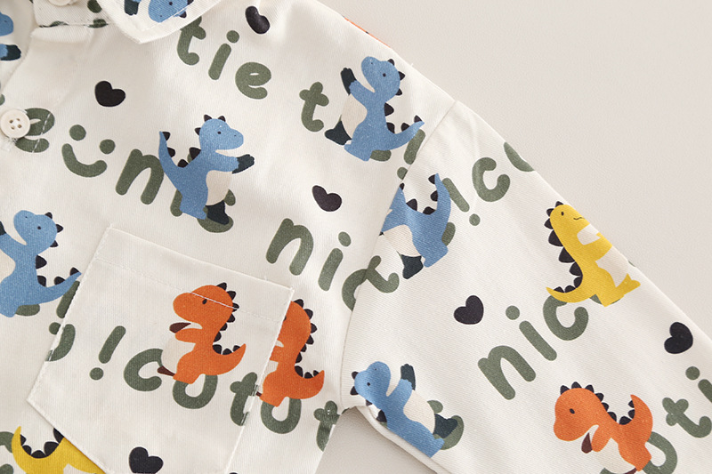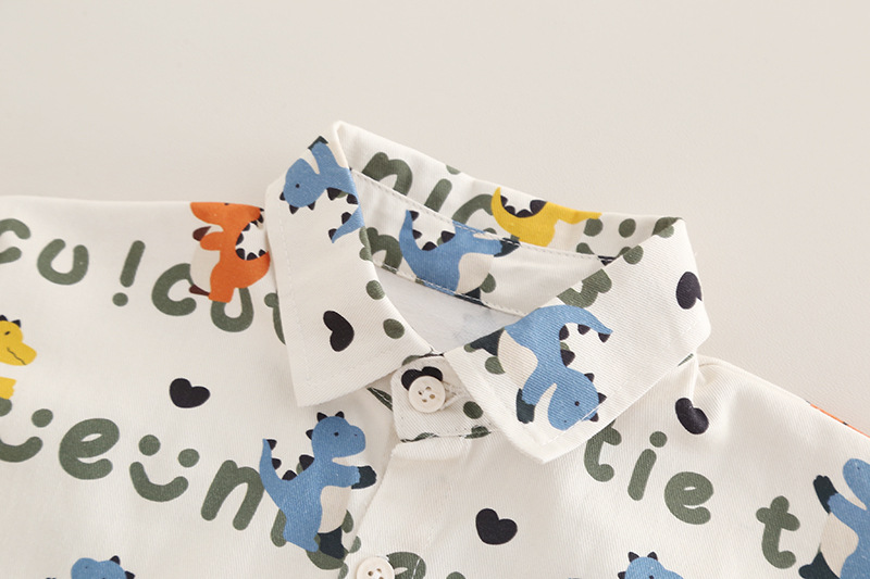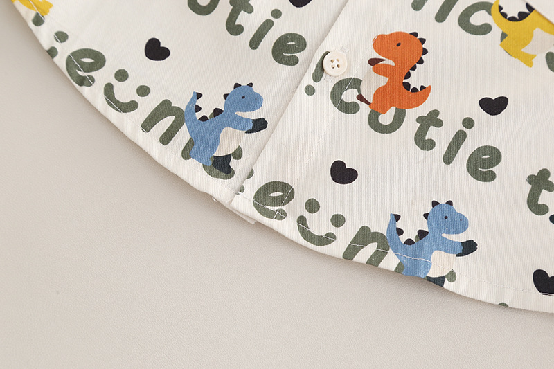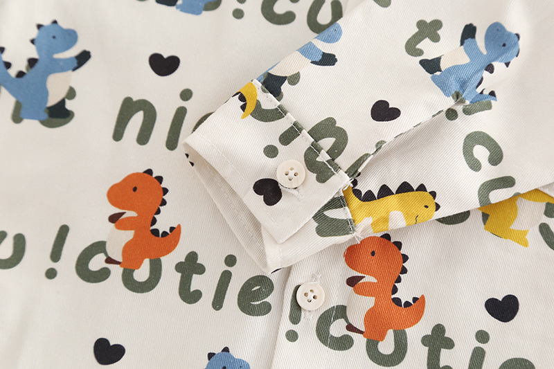 – Риза с дълъг ръкав от памучна материя в кремаво, покрита с all‑over принт на разноцветни динозаври. Класическа яка, копчета по цялата предна линия и преден джоб.