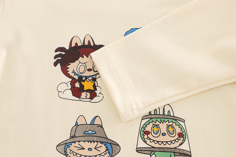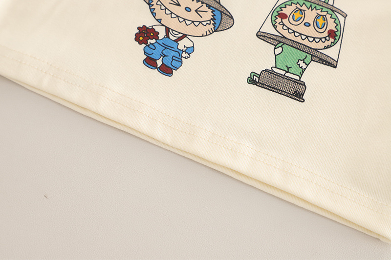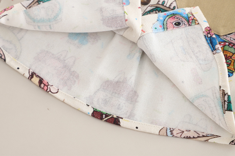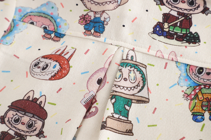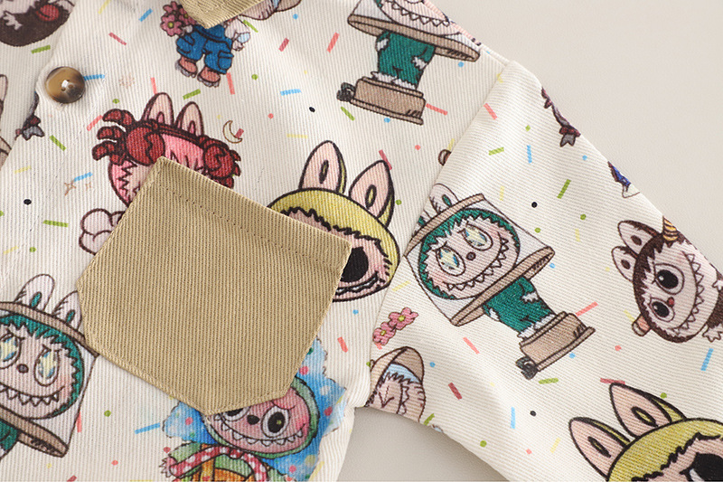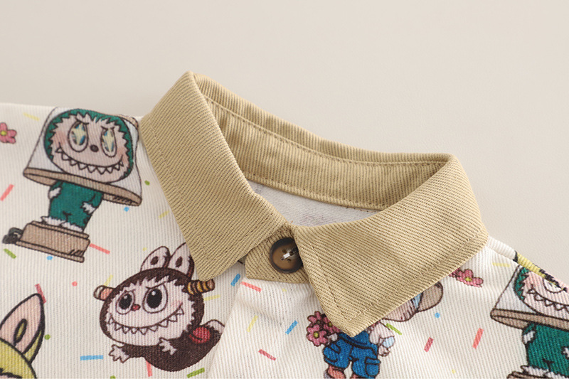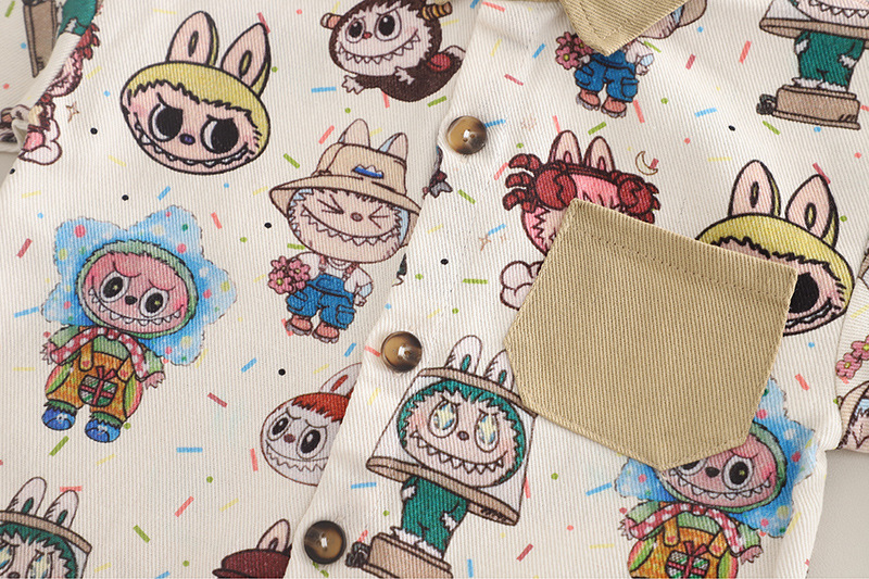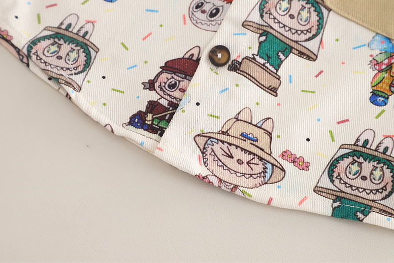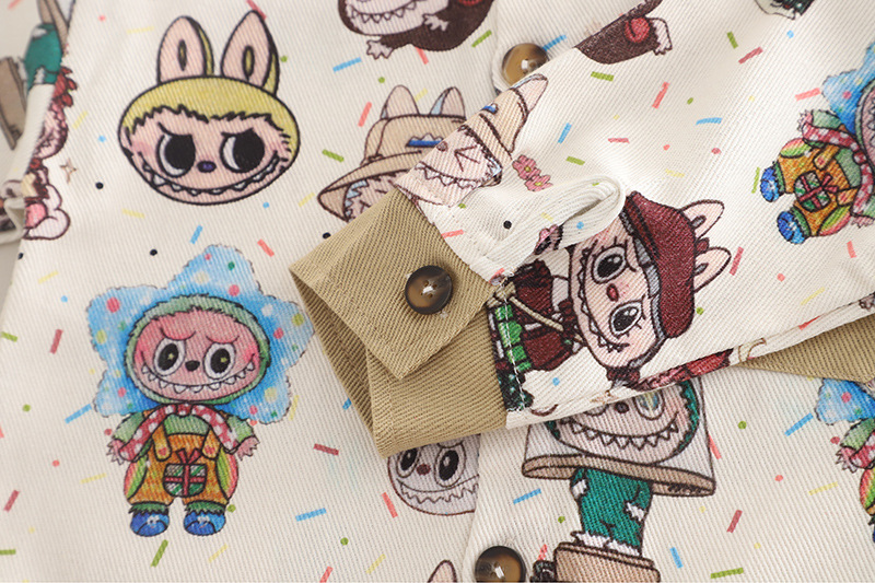 – Риза с шарен принт, изработена от кремава основа с пъстри щампи на различни анимационни герои в костюми. Модел с класическа яка и джоб в контрастен бежов цвят с текстура, наподобяваща кадифе. Дизайнът съчетава ретро и модерен стил в едно.
