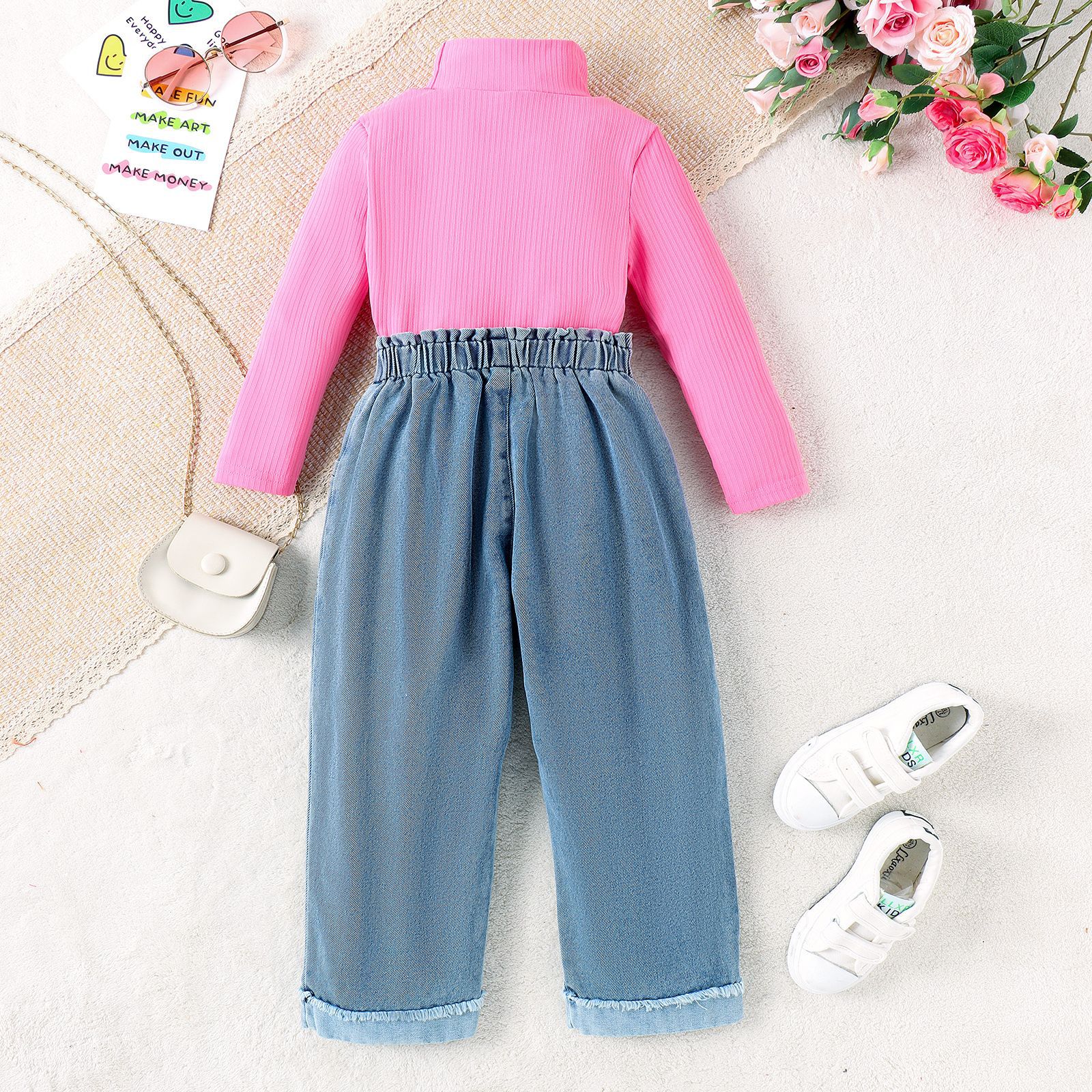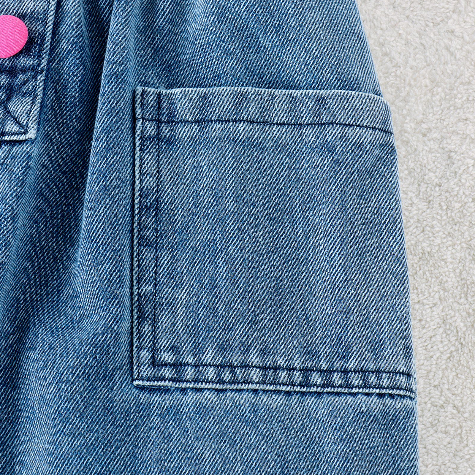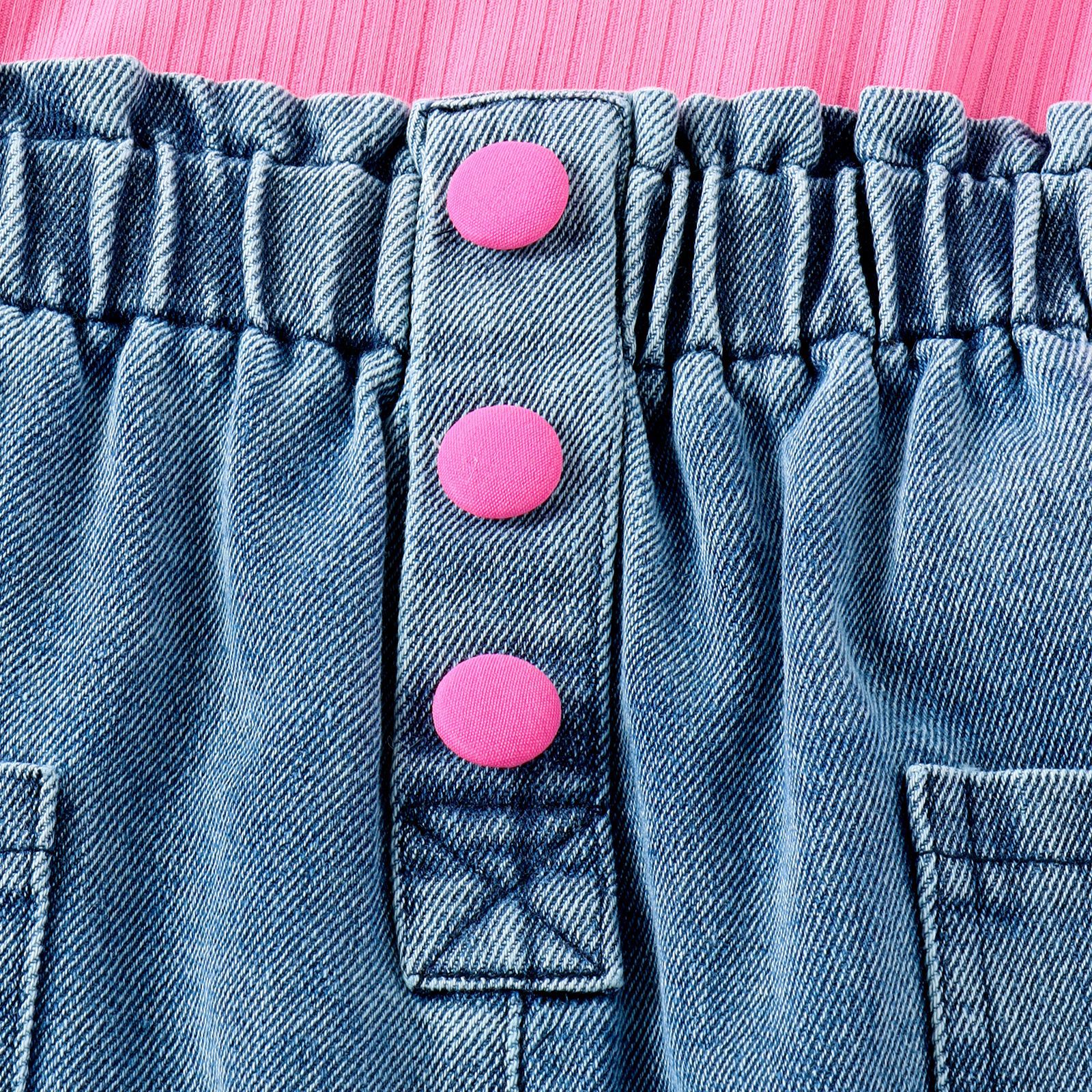 – Дънков панталон с висока талия в класически син нюанс и ефектно подчертана талия с набор. Акцент са трите розови копчета отпред, които се връзват с полото в комплекта. Кройката е свободна и права, а големите външни джобове придават функционалност и характер.