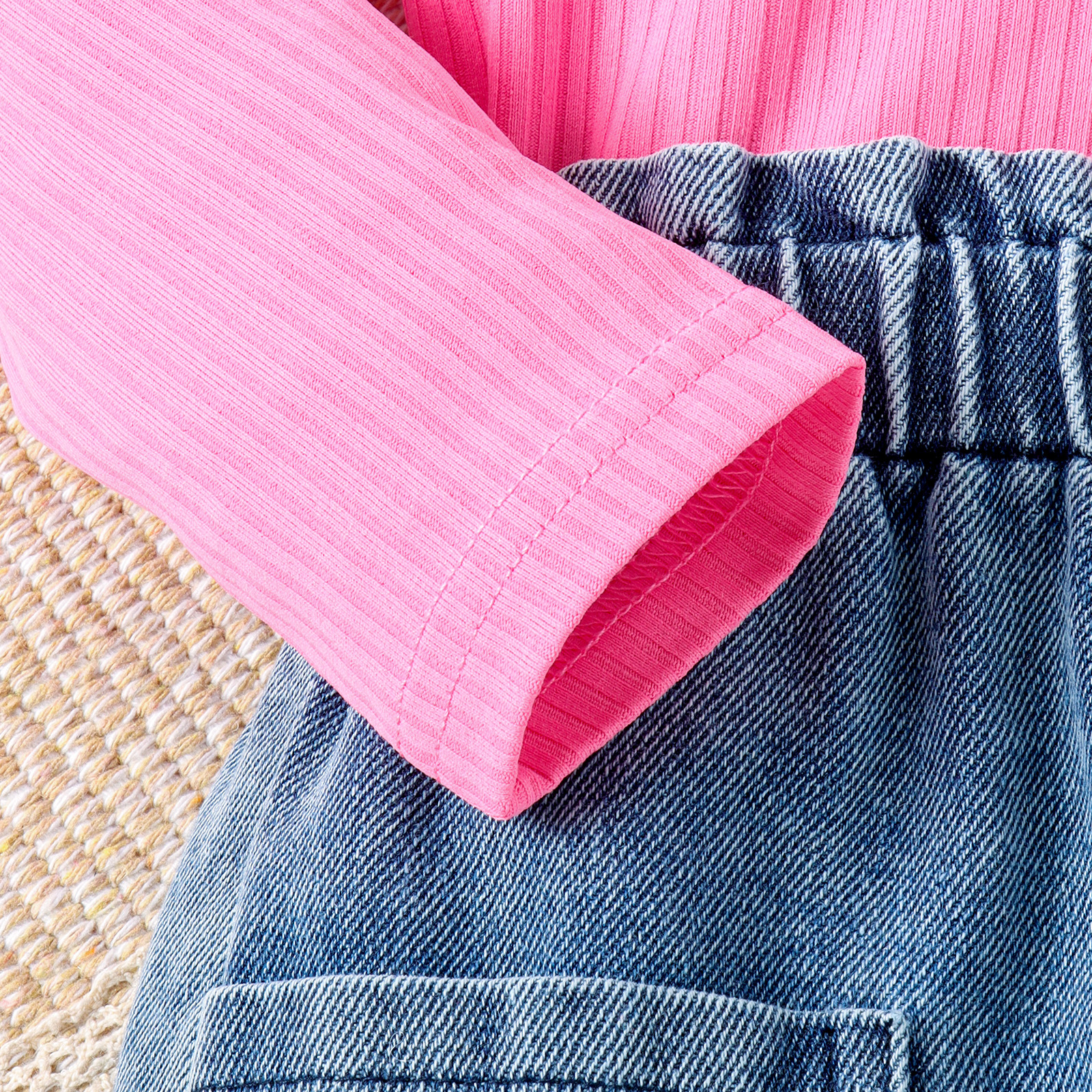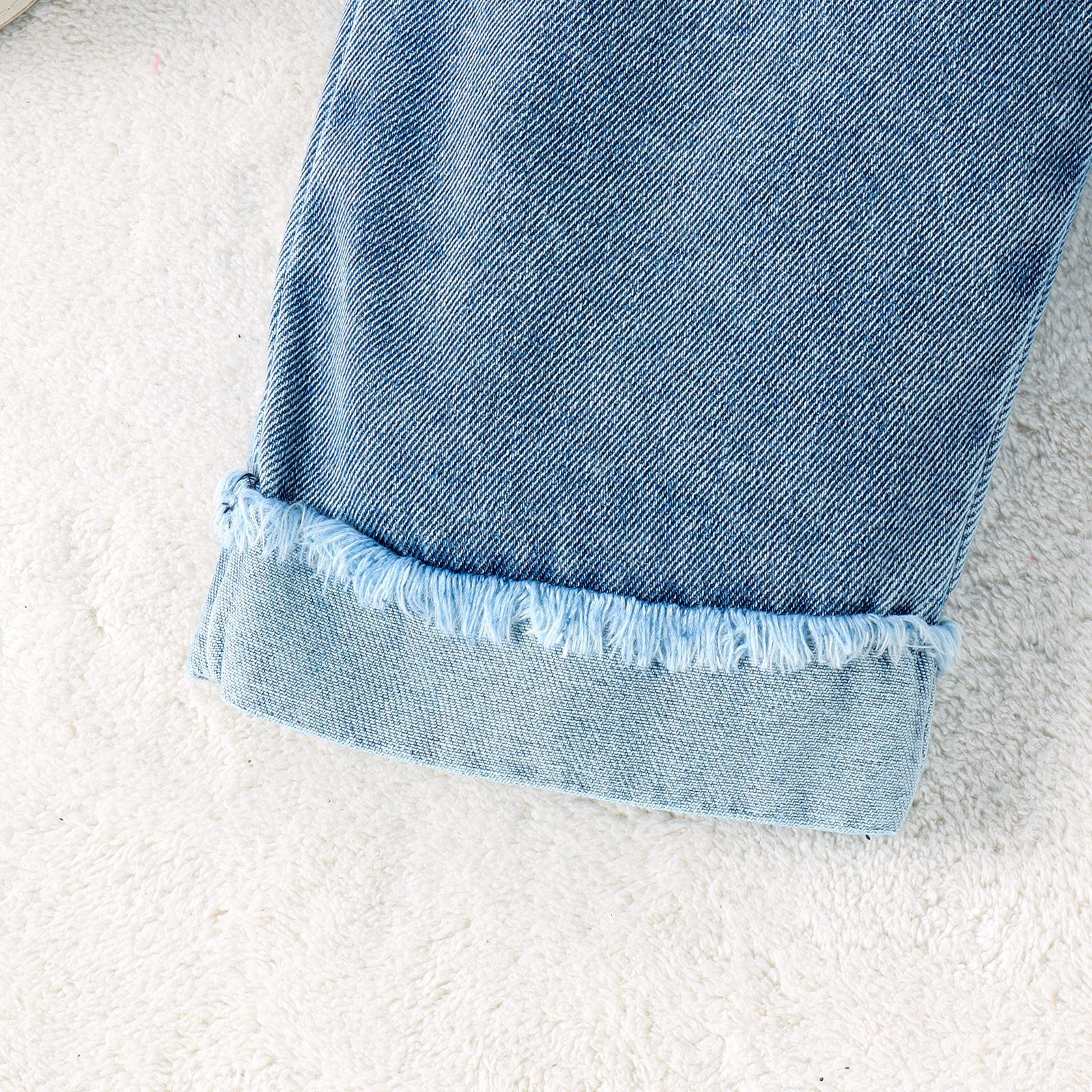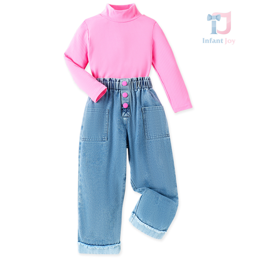 – Дънков панталон с висока талия в класически син нюанс и ефектно подчертана талия с набор. Акцент са трите розови копчета отпред, които се връзват с полото в комплекта. Кройката е свободна и права, а големите външни джобове придават функционалност и характер.
