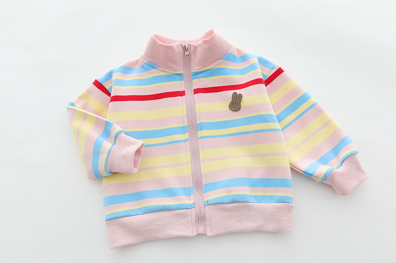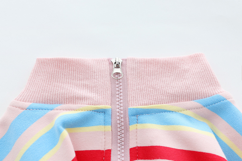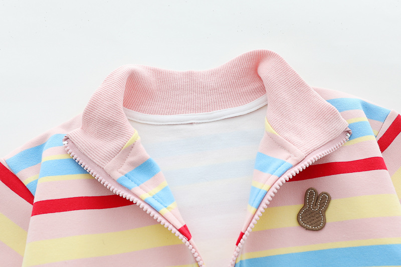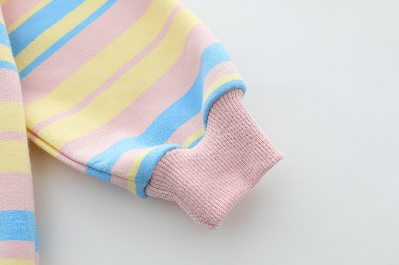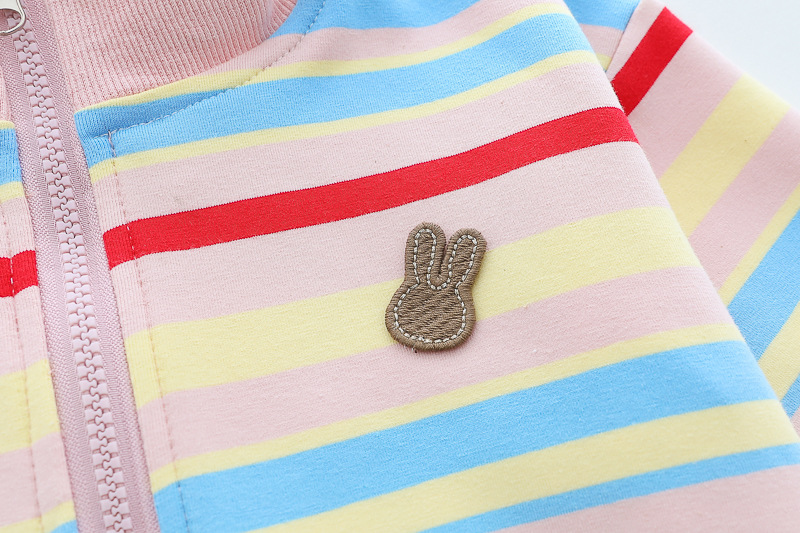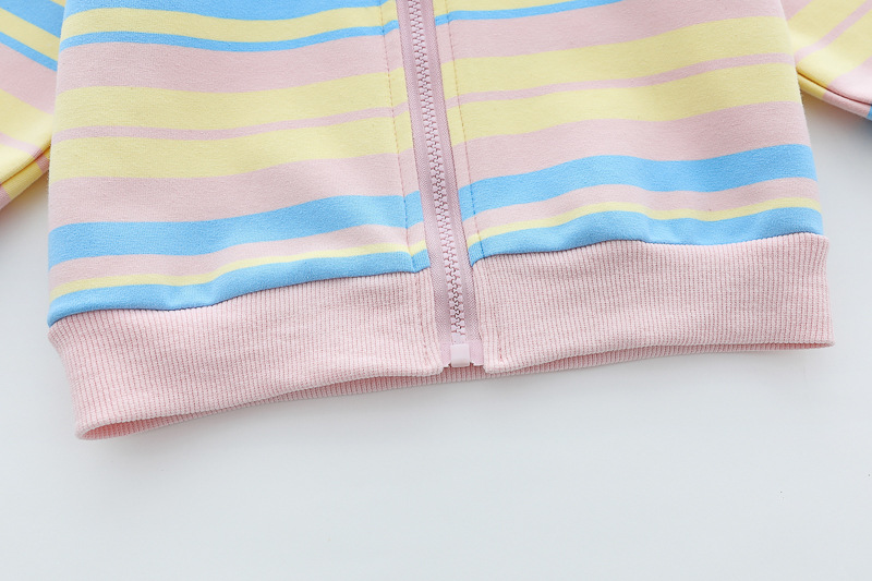 – Суитшърт с висока яка и цял цип от висококачествен памучен плат. All-over разноцветни райета в пастелнорозово, водносиньо, жълто и червено. Реглан ръкави с рипсени маншети и ластичен подгъв – за комфортно прилягане. Малка бродерия „зайче“ на гърдите – за игрив акцент.