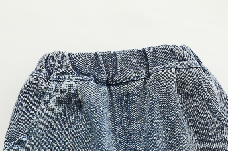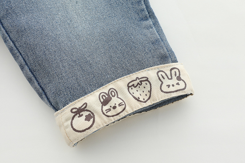 – Дънков панталон в средно син деним с еластична талия за лесно обличане и два странични джоба. Навити крачоли, декорирани с ред шарени щампи на животни – за свеж, модерен детайл.