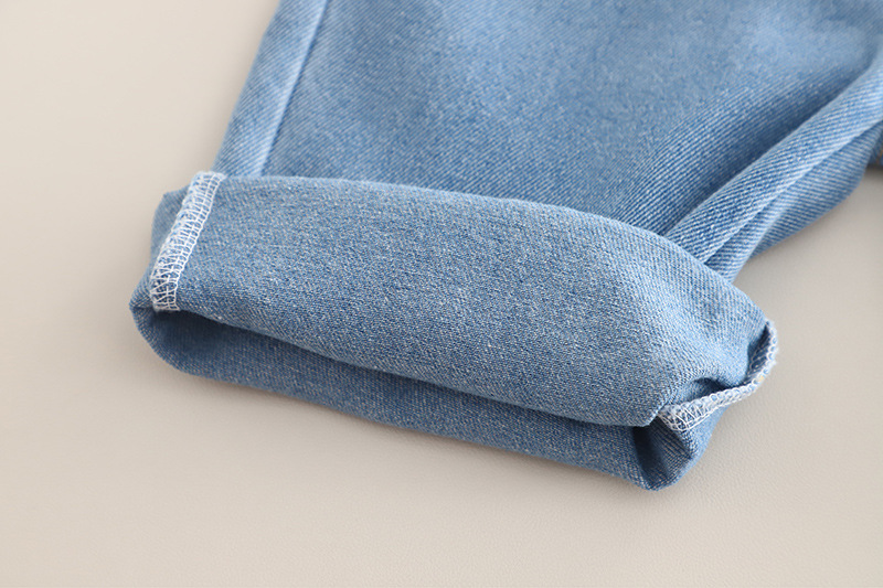 – Дънков панталон в светъл деним с еластична талия за лесно обуване и два странични джоба. Навити крачоли, украсени с фини бродерии на ягодки и зайчета, и леко изтъркан край за модерен вид.
