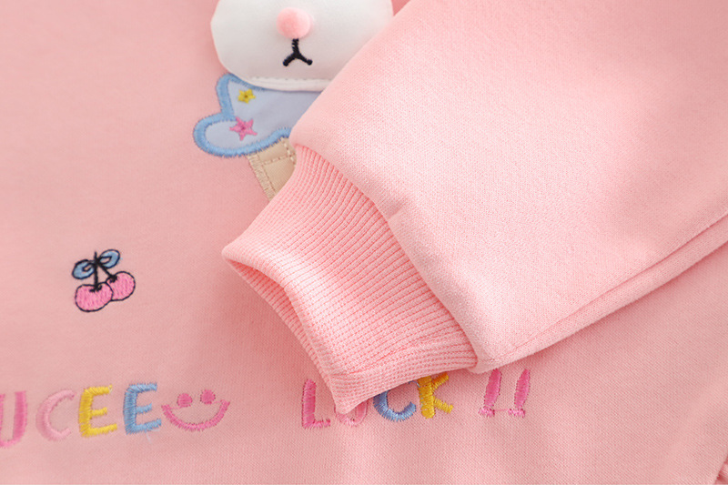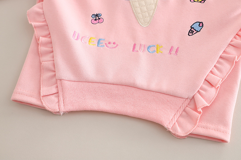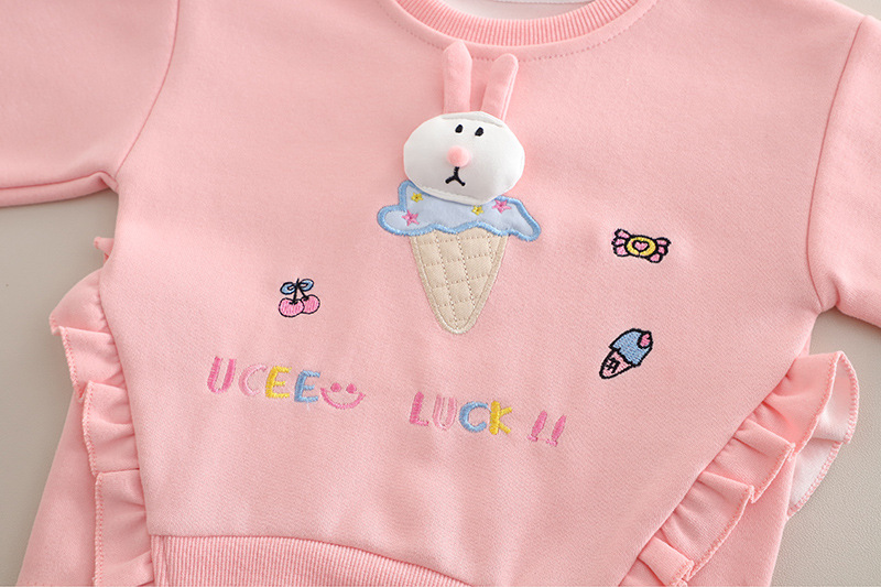 – Суитшърт в розово от меко памук с обло деколте и дълги ръкави с рипсени маншети. Централен 3D мотив „сладолед“ с пухкава зайчешка глава и уши, допълнен от цветни бродерии на бонбонки и надпис “UCEE LUCK!!”. Странични къдри (воланчета) по подгъва за игрив акцент.
