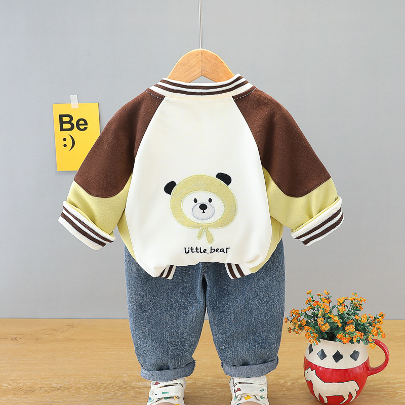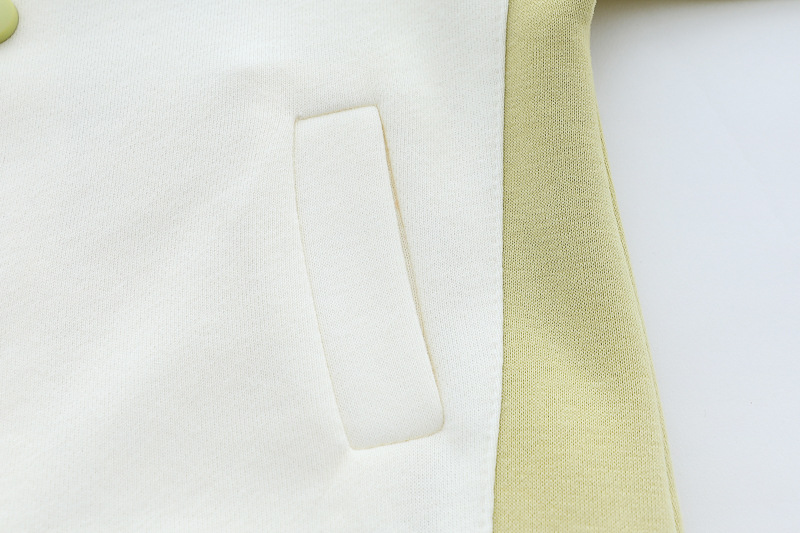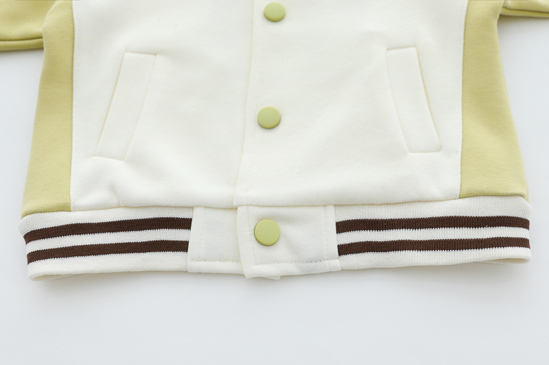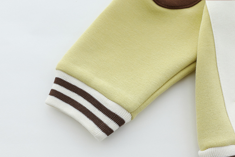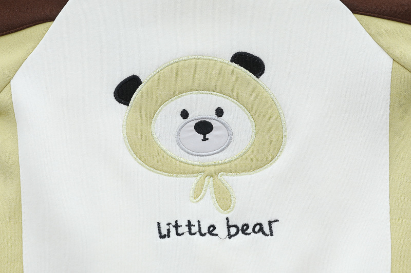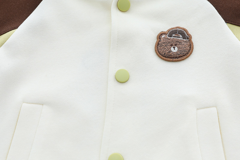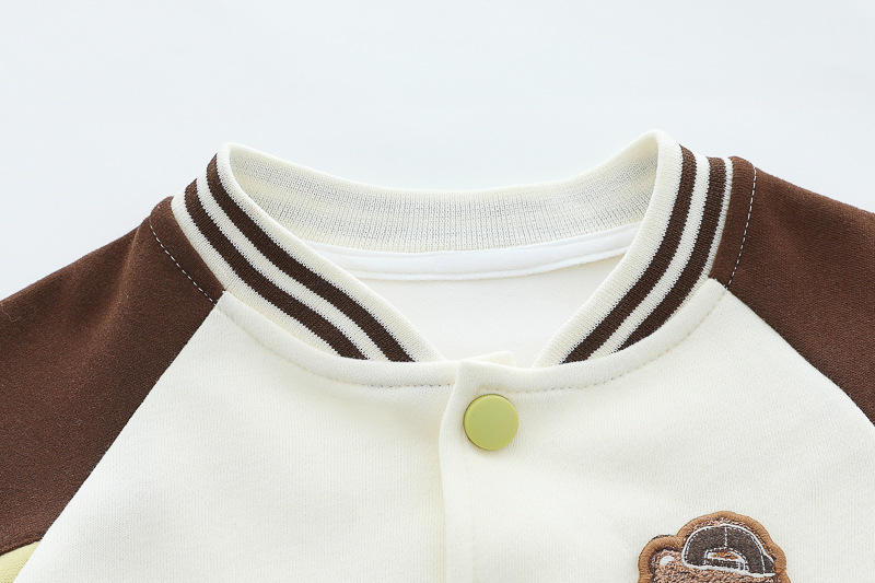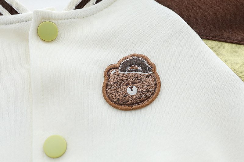 – Яке тип бомбър от мека материя в основен кремав цвят, с ръкави в шоколадово кафяво и светложълто. Моделът разполага с раирани рипсени кантове на яката, ръкавите и талията, придаващи ретро спортна визия. Закопчава се с цветни тик‑так копчета, а апликацията на мече добавя закачлив детайл. Акцент на модела – голяма апликация на гърба.