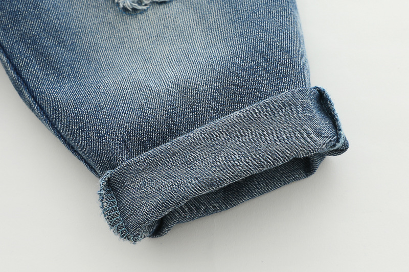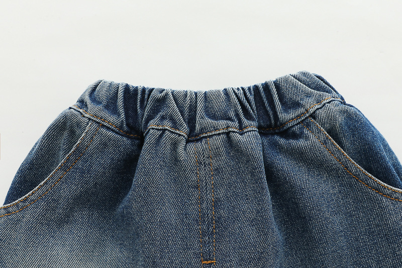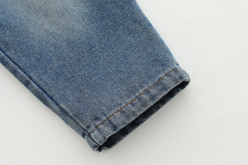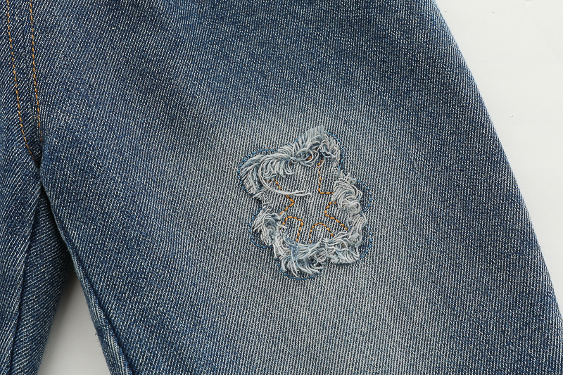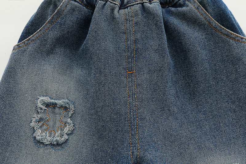 – Дънков панталон със свободна кройка, в класически син нюанс, с декоративни кръпки (изобразяващи мече) на коленете, които придават винтидж и „скейтърско“ излъчване.