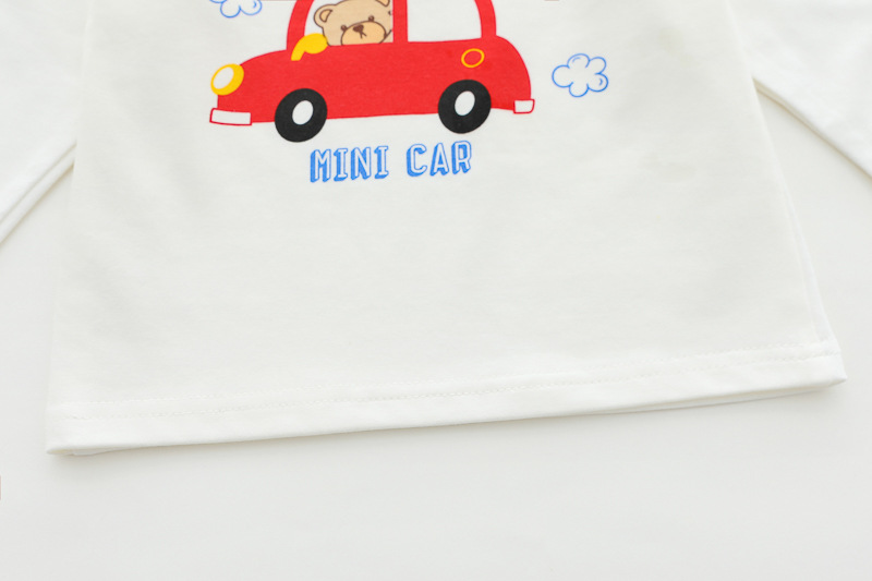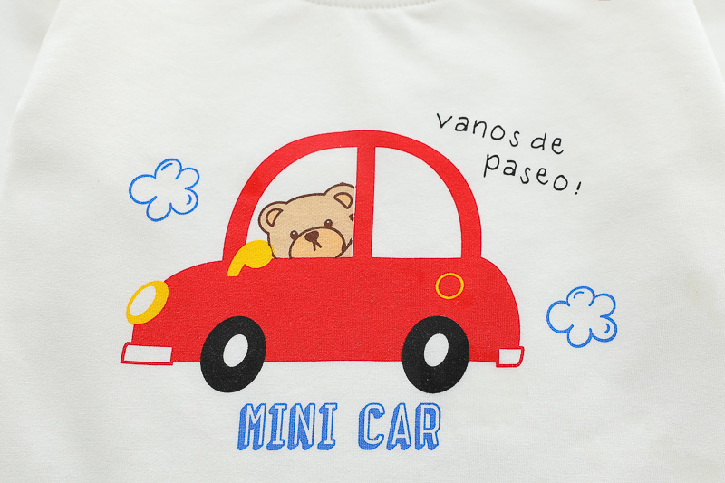 – Бяла блузка от трико, с щампа на червена количка и надпис „Little Car“ – свежо допълнение към комплекта.