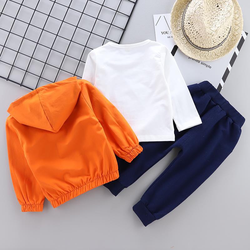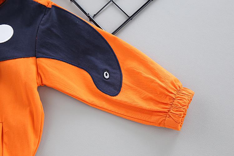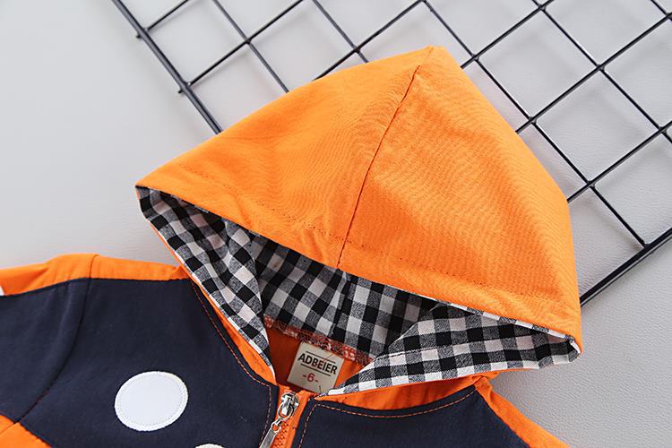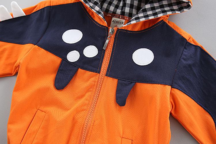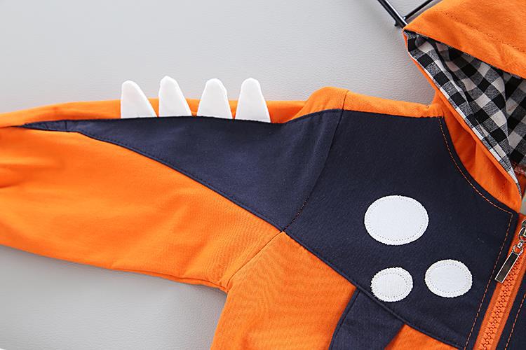 – Яке с качулка изработено от лек, памучен плат в ярко оранжево и тъмносиньо. Декорирано с 3D елементи като бели бодли на ръкавите, зъбки и очички, които създават забавен динозавърски силует. Качулката е подплатена с черно-бяло каре за стилен контраст, а ципът е стабилен и удобен за детски ръчички.